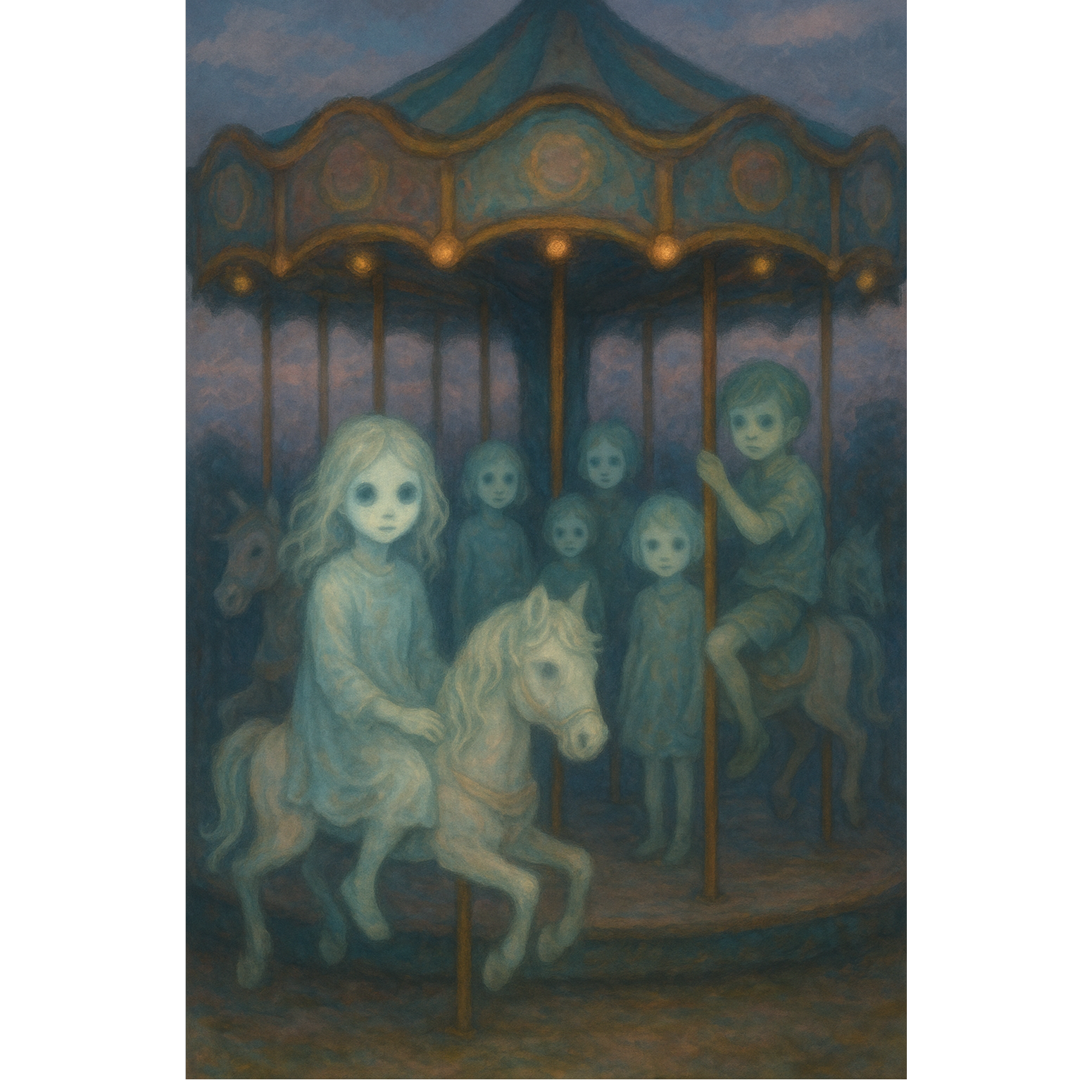 A dark, haunting lullaby that feels like a forgotten children’s circle song, Toybox piano, celesta, and cracked music box tones mix with eerie carousel organs, ghostly choirs, and soft percussive claps reminiscent of a ciranda, Around 85 BPM, Alternating voices: childlike whispers, melodic chants, and surreal spoken passages — forming a hypnotic multilingual ritual, The atmosphere is dreamlike, tragic, and theatrical, The ending unravels into fading hums and broken clockwork echoes, like a carousel losing its last breath in the dark