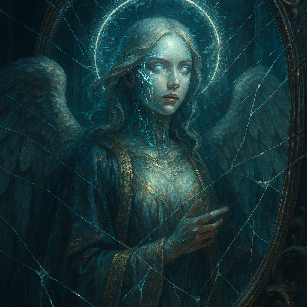 Minimalist cinematic darkwave / ambient electronic hymn, BPM: 68, Key: D minor, Mood: haunting, sacred, poetic, and unnerving — like a prayer echoing in a digital cathedral, Instrumentation: sparse piano or soft bells, deep sub-bass, atmospheric drones, glitch textures, reversed choirs, and whispered vocals, Vocals: ethereal, intimate, and fragile — half-spoken, half-sung, like a ghost trying to pray, The music should feel spiritual yet corrupted, divine yet decaying, Build slow tension with reverb-heavy layers and ghostly harmonies, The tone is cinematic, elegant, and terrifyingly calm — beauty inside horror, Imagine faith rendered in code, silence that breathes, and a prayer made of glass