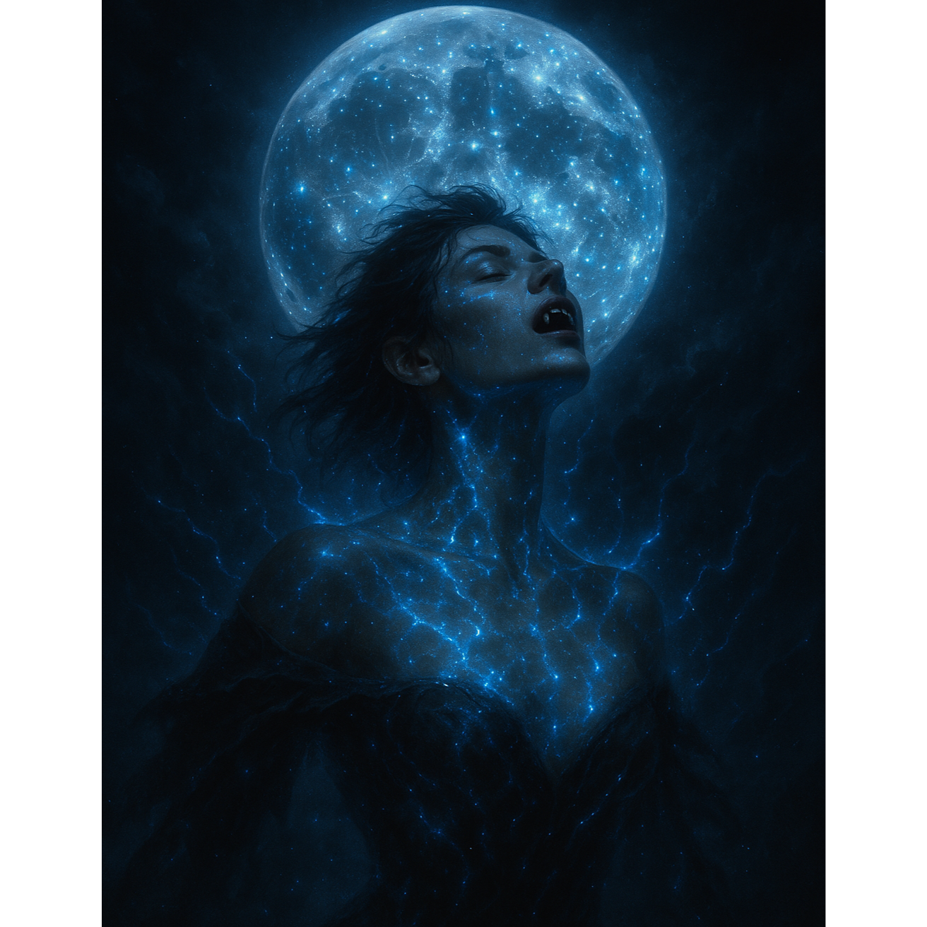 Cinematic dark synthpop, synthwave, EDM, drum’n’bass elements, symphonic metal strings, The mood is intense, nocturnal, and transformative, like a supernatural metamorphosis under the full moon, The song should blend electronic and orchestral textures: pulsating basslines, shimmering synth arpeggios, dramatic choirs, and hybrid drums, Vocals should sound powerful yet haunted, alternating between whisper and explosion, A mix between K-pop theatrical intensity, anime soundtrack grandeur, and gothic electronica, Include layered harmonies, rising crescendos, and a climactic outro that feels like the moon devouring the night