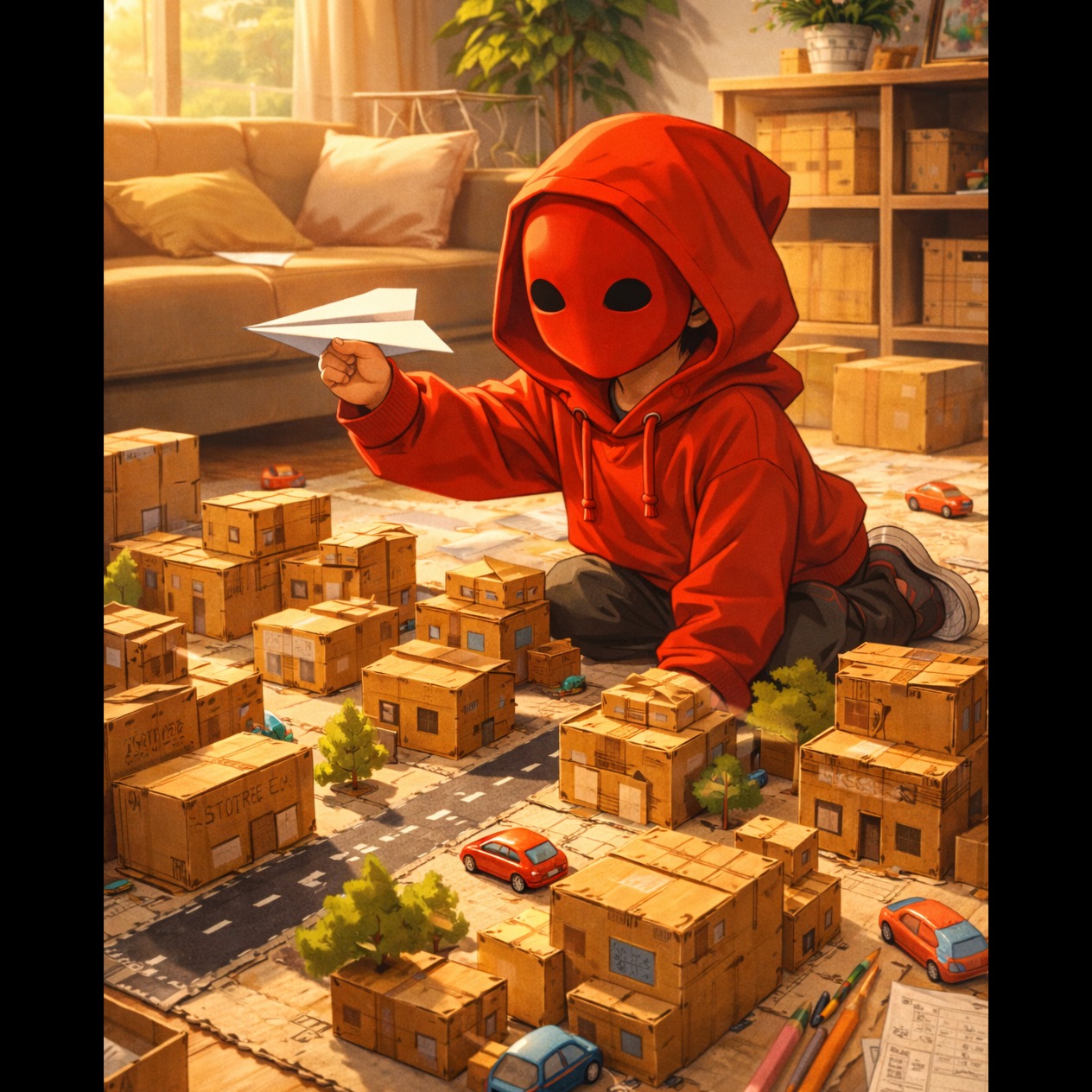 Warm, expressive, vocals with emotional clarity, soft and intimate in verses, rising into soaring, nostalgic, anthemic choruses, with gentle layered harmonies in the final chorus, Acoustic guitar is the core, finger-picked and lightly strummed, warm and organic, Subtle indie-pop percussion (soft kick, light snare, delicate hi-hats) drives rhythm without overpowering, Minimal bass supports the chords, Light cinematic strings and ambient pads gradually build in choruses and bridge, adding a sense of wonder, Optional soft piano accents in verses enhance emotion, Indie-pop / folk-pop with orchestral touches, nostalgic, bittersweet yet hopeful, anthem-ready choruses designed for sing-alongs, Structure: Verse → Pre-Chorus → Chorus → Verse 2 → Bridge → Final Chorus, Mid-tempo (90–105 BPM), major or mixed key for emotional lift, Theme: childhood imagination vs growing up, building worlds from cardboard cities and paper planes, memories that felt real and infinite