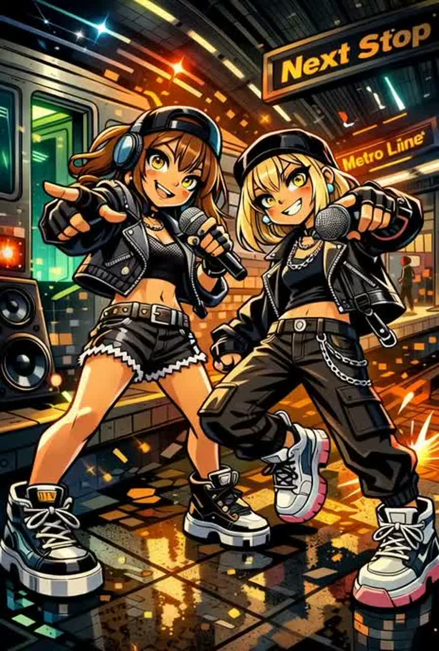 Girl A – slightly husky, aggressive, emotionally intense tone delivering rapid-fire double-time rap verses with sharp rhythmic precision, Girl B – clear, confident, melodic yet powerful tone delivering fast rap secti