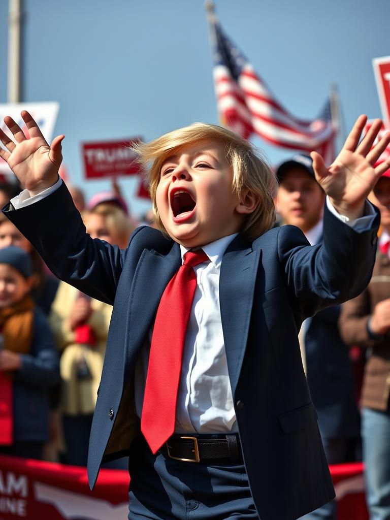 child, eight or nine, voice high, trembling, urgent, flailing their arms, yelling at the invisible chaos of politics