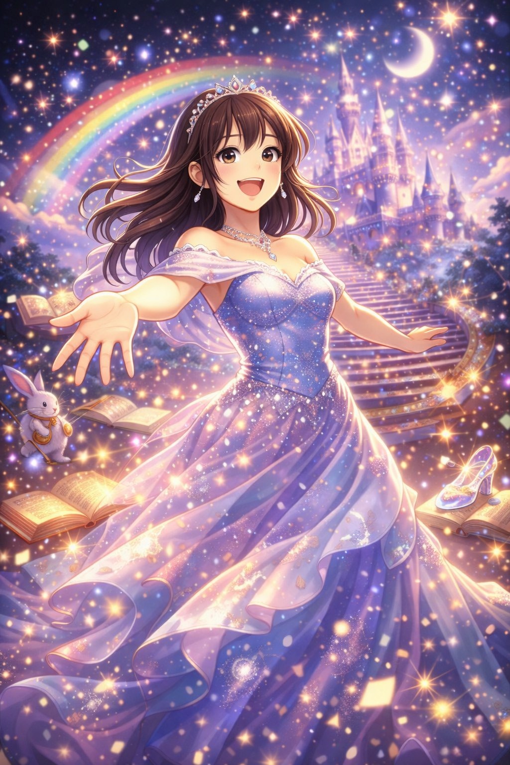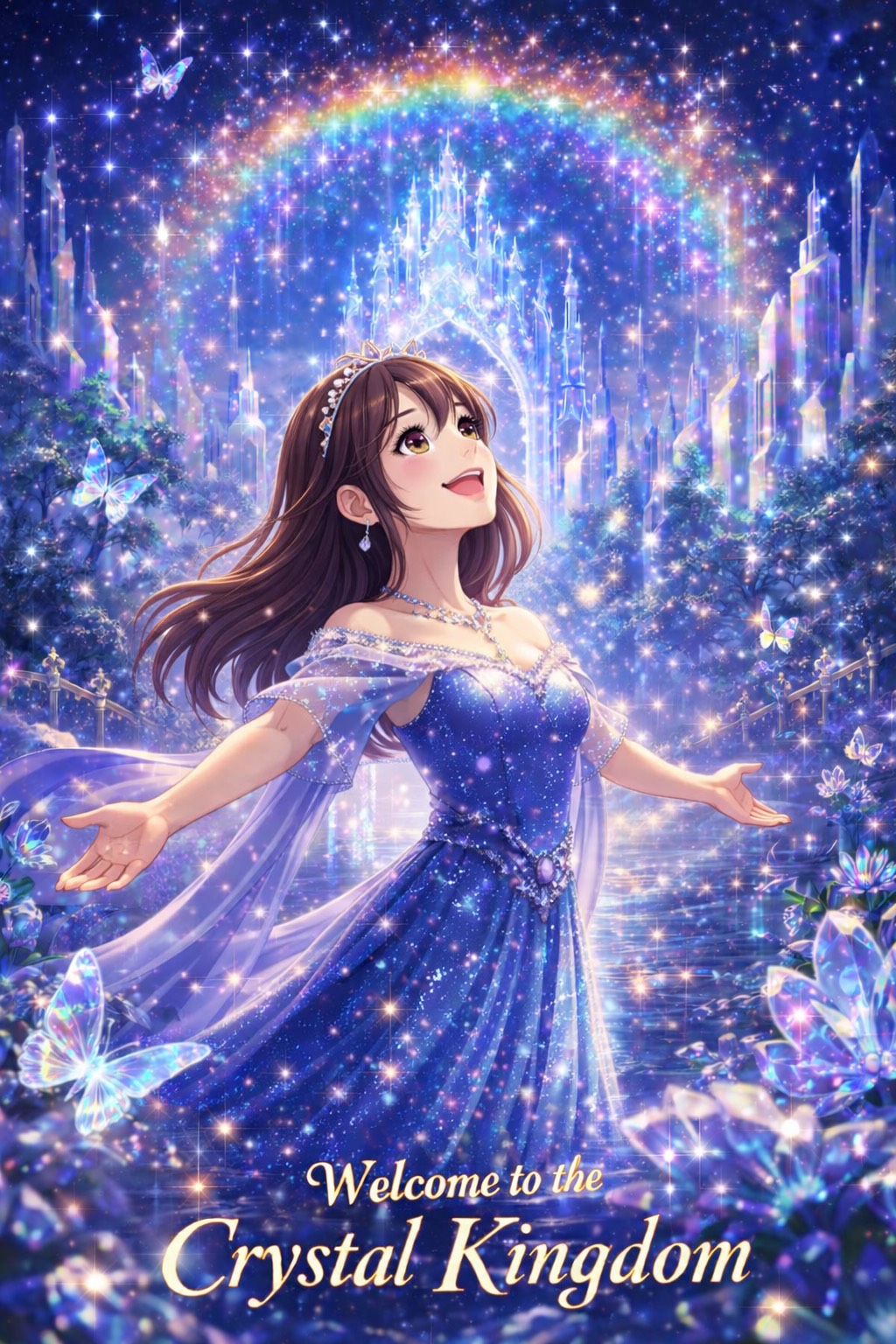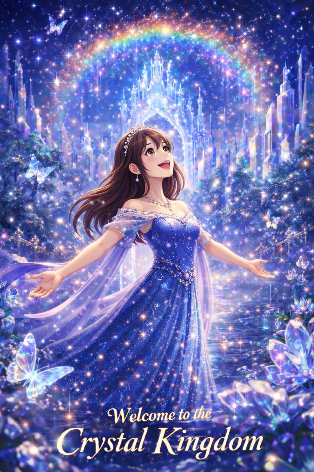 Disney Musical, Grand Orchestral Waltz, Cinematic Fantasy, 3/4 Time Signature, 95 BPM, Structure: Magical Intro, Verse 1, Pre-Chorus, Chorus, Verse 2, Pre-Chorus, Chorus, Crystal Dance Break, Emotional Bridge, Key Change, Grand Finale, Outro, Vibe: Majestic, Royal, Sparkling, Awe-Inspiring, Triumphant, Elegant, Instruments: Glass Harmonica, Celesta, Full String Orchestra, Harp, Chimes, Brass Section, Choir, Vocals: Clear Female Vocals, Expressive, Full of wonder, Building to Powerful Belting