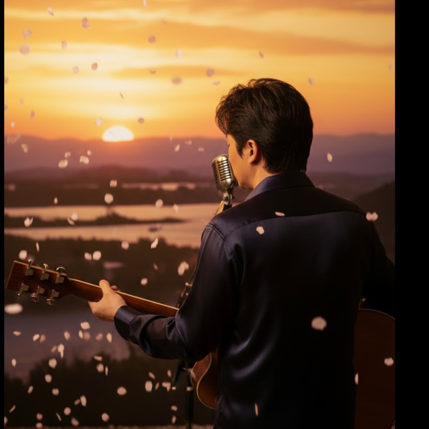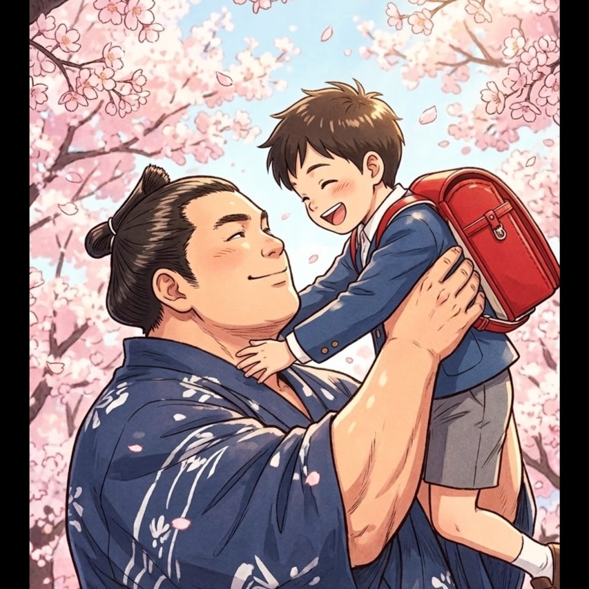 Japanese enka ballad, gentle and emotional, warm fatherly love, spring graduation / school entrance ceremony atmosphere, cherry blossoms drifting in the wind, a sumo wrestler on tour thinking of his son's first school day from far away, Soft and tender rather than grand or heroic, Male vocal, low to mid register, heartfelt, slightly husky, restrained emotion, dignified but kind, Traditional enka with modern ballad touches, Shamisen accents, soft piano, warm strings, subtle acoustic guitar, light taiko and brushed percussion, spacious arrangement, sentimental and nostalgic, Tempo slow to medium-slow, expressive phrasing, strong melodic hooks, cinematic but intimate, bittersweet hope, Japanese sentimental ballad