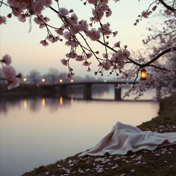 v5, Bossa Nova, Soft Spring Evening, Gentle female vocal with warm, intimate tone — subtle vibrato, natural phrasing, Tempo 92–104 BPM, classic bossa groove with light syncopation, Nylon-string acoustic guitar as the rhythmic foundation, upright bass walking softly, brushed drums with delicate rim clicks, soft piano chords, airy flute or tenor sax accents, Romantic cherry blossom viewing atmosphere — lanterns glowing, petals drifting along a quiet river, calm dusk sky, Breezy, elegant, slightly nostalgic but peaceful, Chorus opens harmonically with richer jazz chords (maj7, 9ths, 13ths), Organic live-room feel, warm analog texture, No electronic drums, no synth leads, no heavy percussion, Focus on gentle sway, intimacy, and poetic storytelling