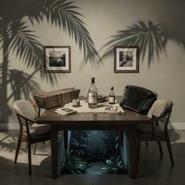 dark cumbia, Colombian percussion ensemble, six part vocals, call and response chorus, marimba ostinato, guitar tres riffs, hand drum syncopation, accordion stabs, muted trumpet lines, minor key harmony, dim room ambience, tape saturation, close mic choir, propulsive 96 BPM, tense groove, dramatic build, haunted family saga