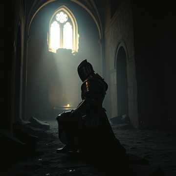 Create a dark, cinematic song with orchestral elements (strings, low brass, distant choir), in a dramatic ‘fallen knight’ theme, The mood should be heavy, emotional, and haunting — somewhere between dark fantasy and tragic heroism, Avoid pop structure; lean into slow builds, tension, and epic atmosphere, Use minor key, deep reverbs, and a sense of ancient ruin or lost honor, Vocals should feel raw and expressive, with layered choral textures in the background, The song should feel like a confession and redemption arc, with rising intensity from quiet, intimate verses to a powerful, orchestral climax, Subtle dark magic / medieval undertones are welcome