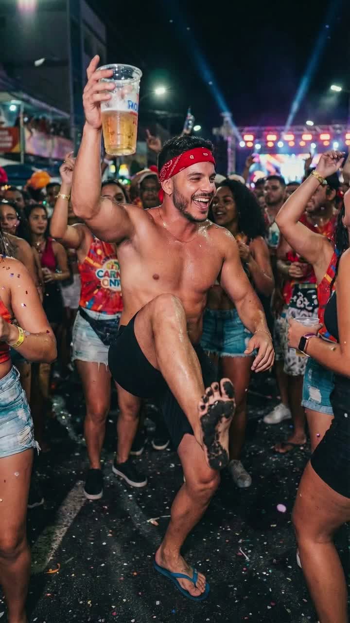 An energetic carnival samba fused with agitated boom bap, at a fast tempo (100–115 BPM), The vibe should feel like beach football during Carnival, raw, joyful, competitive, and full of movement, Build the rhythm with traditional samba percussion (surdo, tamborim, caixa, repique) driving the groove, layered over boom bap drums with punchy kicks and crisp snares, The swing must feel organic and bouncy, blending street cypher energy with bloco de carnaval spirit, Add lively brass stabs, cavaquinho riffs, and rhythmic call-and-response chants, giving it that strong Bahia street vibe, The bassline should groove hard, playful but powerful, Vocals should be high-energy and charismatic, alternating between rap flows and sung carnival-style hooks, with crowd chants in the background, Production style: colorful, rhythmic, and explosive, but still gritty enough to keep the boom bap punch, Genres: Samba, Boom Bap, Brazilian Street Fusion