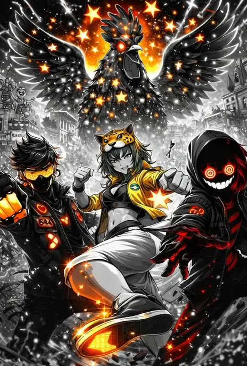 Hyperactive Brazilian breakbeat meets gabber kicks and jungle breaks; 180–195 BPM rave energy with chopped baile funk percussion, detuned hoover leads, and deep Reese bass, Male vocals, half-rapped, half-chanted, Hooks stack in gang shouts; verses stay tight and percussive, Occasional filtered breakdowns then explosive drops with crowd call‑and‑response, breakbeat, jungle