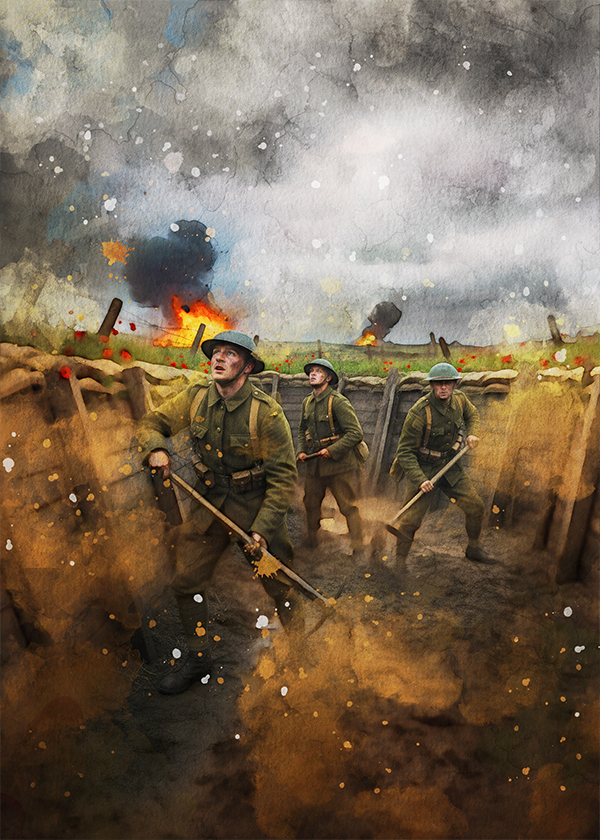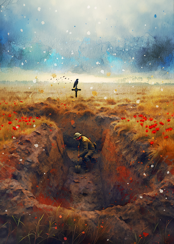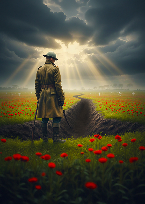 Instrumental arrangement lasting 5 - 6 minutes played by a Symphony Orchestra and accompanied by a Progressive Rock Band, Style: Atmospheric song of war, flowing rhythmic orchestral intro with lush strings, flutes and French horn with interludes filled with finger-picked acoustic guitar and subtle Hammond organ undertones, melodic bass lines, dynamic build from intimate to epic, psychedelic rock narrative style, minor key with modal shifts, cello countermelodies, cinematic grandeur and 1970s prog rock spirit with gravitas and world-weariness, ‑Rap, ‑Country, ‑Hip-Hop