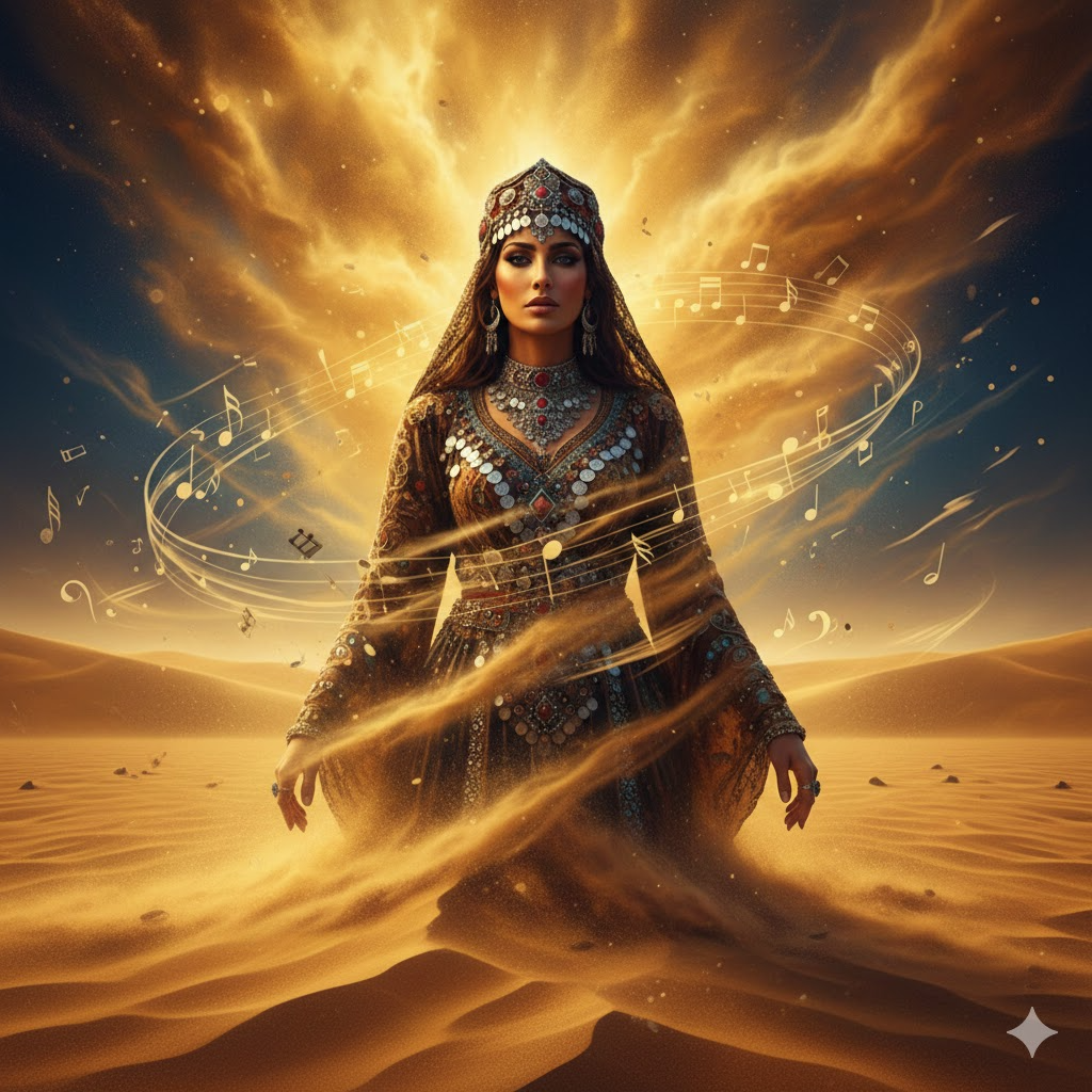 Ethno-Disco, Middle Eastern Orchestral Pop, massive multi-layered female chorus, wall of sound harmonies, ethereal vocal stacks, powerhouse female contralto lead, heavy driving percussion ensemble, Darbuka and Riqq, pulsating synth bass, soaring cinematic strings, Chorus: dominant polyphonic choir, lush gospel-style vocal layering, epic and wide stereo field, high-energy, 120 BPM