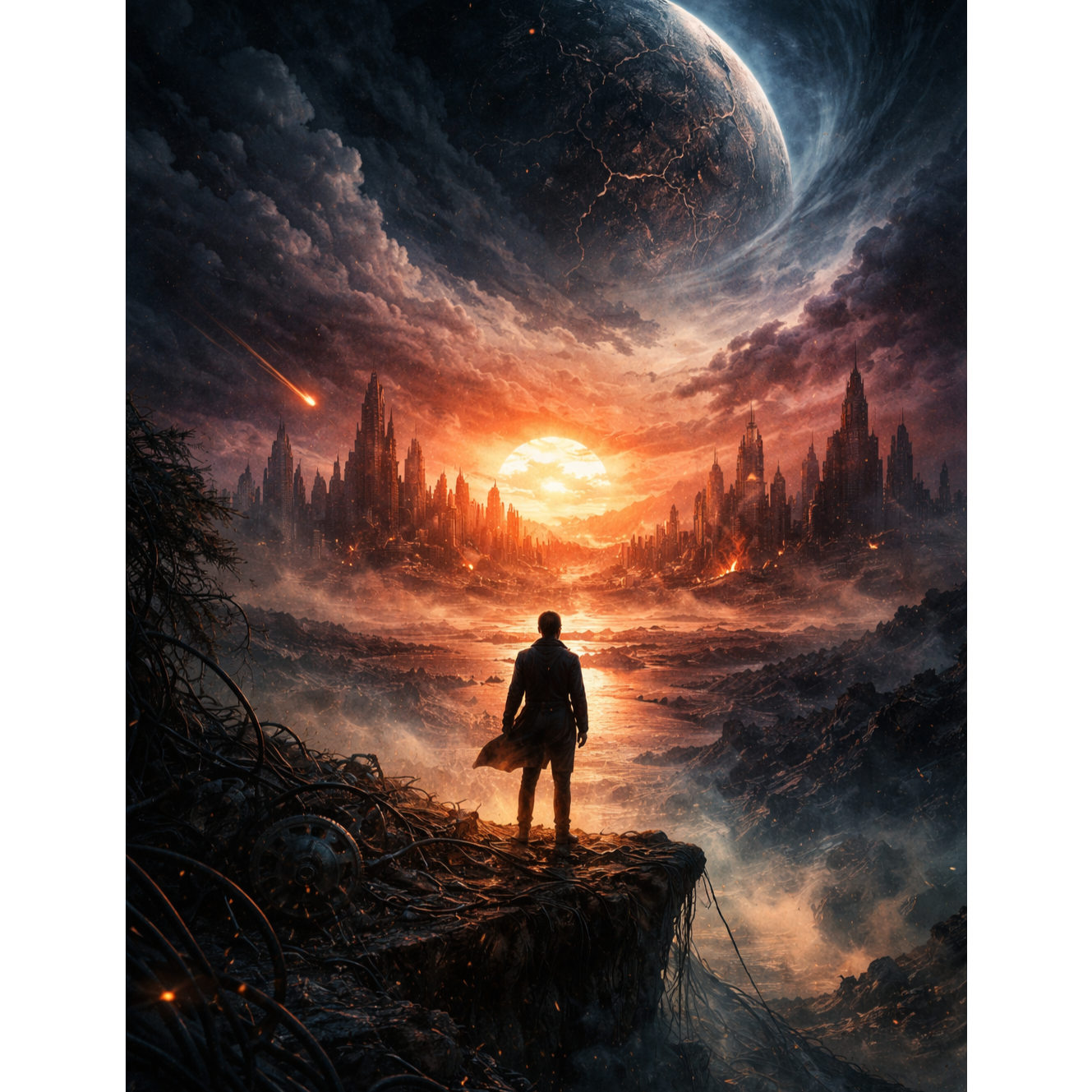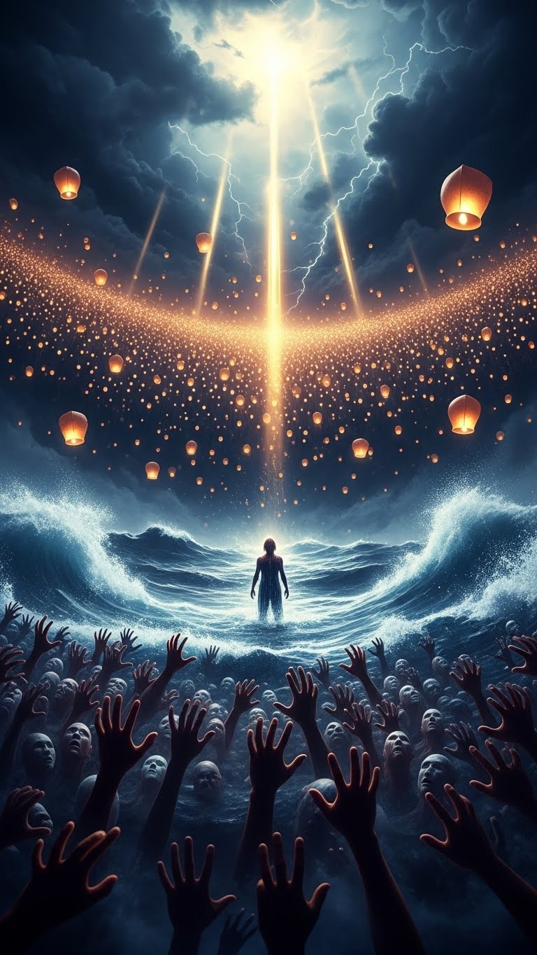 Symphonic progressive rock track, dark and solemn, inspired by the spirit of “Epitaph” by King Crimson, Slow tempo (≈60–65 BPM), minor key, Intro with haunting Mellotron pads and sparse acoustic arpeggios, Verses are intimate and tragic, led by a male baritone vocal, fragile yet authoritative, Choruses feature lush, layered hymnal harmonies, grand and majestic, Apocalyptic, melancholic, prophetic atmosphere, Bridge builds into a dramatic orchestral swell with near-operatic choir, Expressive, sorrowful electric guitar solo supported by ethereal backing choir “oohs, ” Warm 1970s-style analog production, wide dynamic range, deep reverbs, Ending fades into near silence with a lone voice and slow Mellotron decay or abrupt stop, Use exactly the provided lyrics, strictly following the indicated structure (intro, verses, choruses, bridge, solo, outro), Mood: fatalism, compassion, collective tragedy, existential poetry