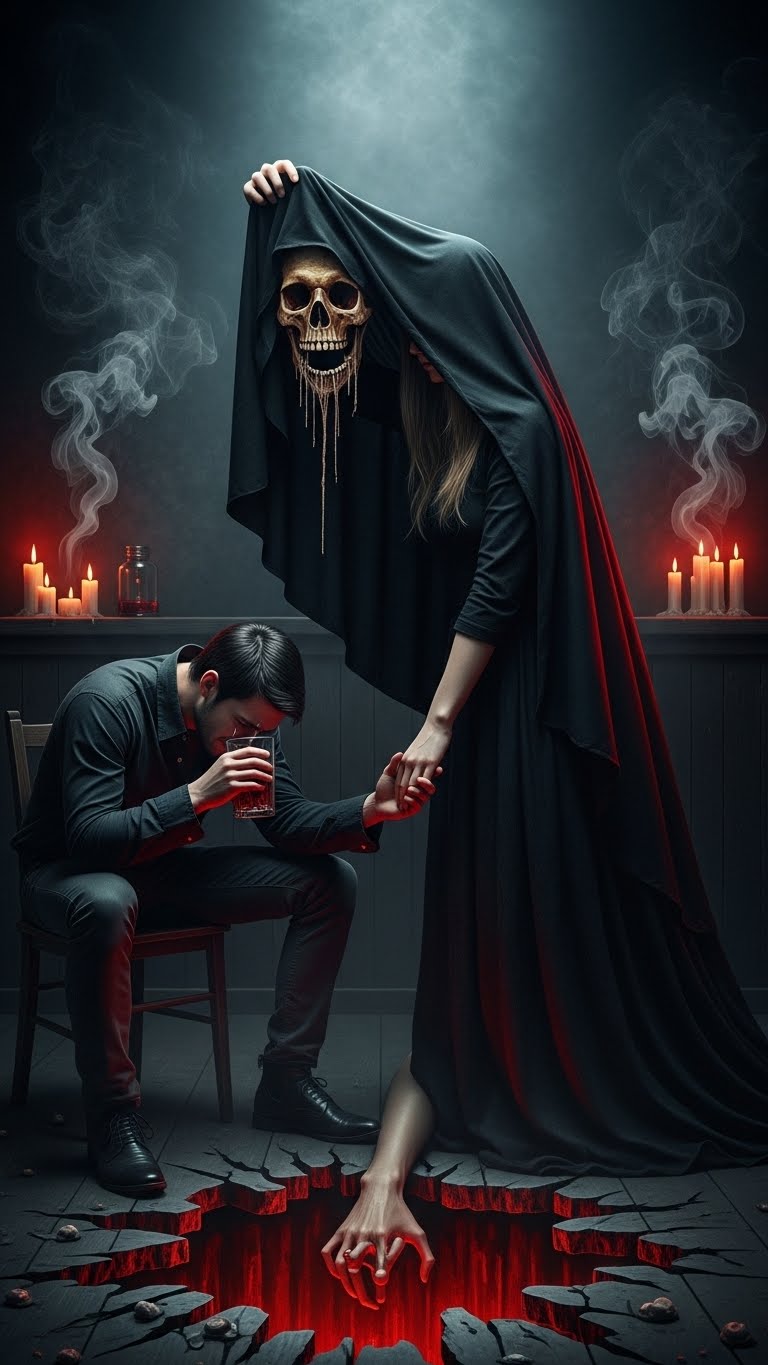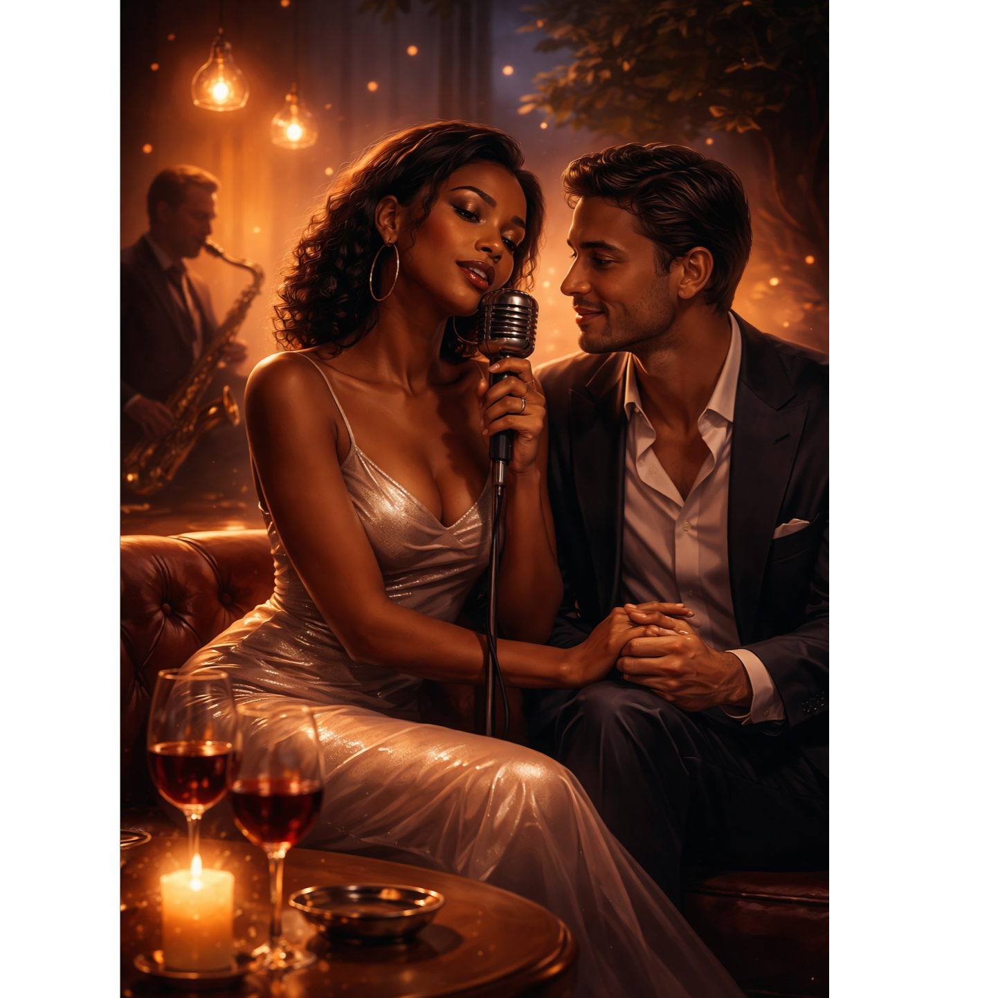 Late-night blues jazz club neo-soul ballad (65–70 BPM), smoky, intimate, Female lead vocal very deep, husky, raspy, blues-soaked, inspired by Sade Adu with jazz-blues edge, Heavy chest voice, breathy texture, subtle vocal fry, expressive bends/slides, spoken-sung verses, loose timing, seductive, behind-the-beat, Chorus low, dark, restrained, Backing vocals (choruses/final chorus): low, smoky harmonies, close intervals, soft “ooh/ahh” hums, light lyrical doubles, haze-like blend, Final chorus fuller, Arrangement: upright bass, brushed drums, warm Rhodes/acoustic piano, muted jazz guitar, sultry sax with solo sections in instrumental breaks, bridge, and outro, responsive fills between vocal lines, Extended jazz/blues chords (m9, 13, dom7♭9), Bridge stripped to voice + piano + sax, Outro: husky ad-libs, sax fills, soft vocal improvisations, slow fade, Timeless, intimate, sensual jazz club vibe