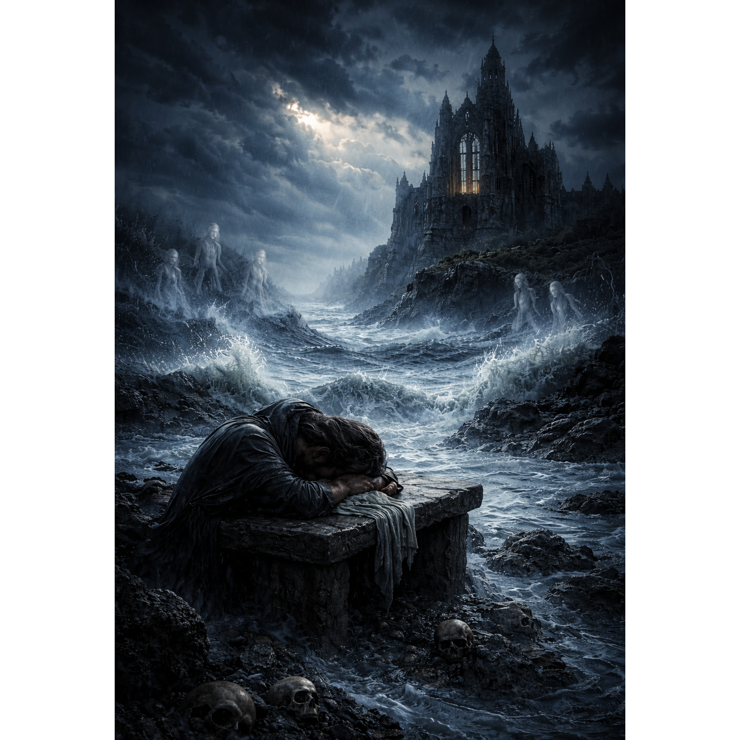 Epic gothic rock, dark, cinematic, theatrical, driving rhythm, 0:00–0:20 intro: echoing guitars wide, deep bass center, cathedral pads, subtle drums, slow crescendo, 0:20–0:50 verse: deep male baritone, soft but expressive, key syllables emphasized, 0:50–1:20 Chorus: explosive male harmonized vocals, epic, layered, rhythmic pulse, cinematic grandeur, slight vibrato, soaring energy, 1:20–1:50 instrumental: guitars, pads, rising drums, brief pauses, crescendo, 1:50–2:20 verse repeat: baritone, subtle modulation, emotional accents, 2:20–2:50 chorus: full harmonized vocals, cinematic climax, layered instruments, rhythmic accents, 2:50–3:00 outro fade: echoing pads, reverb, decrescendo, Tempo ~80 BPM, doom-tinged, melancholic, epic dark textures