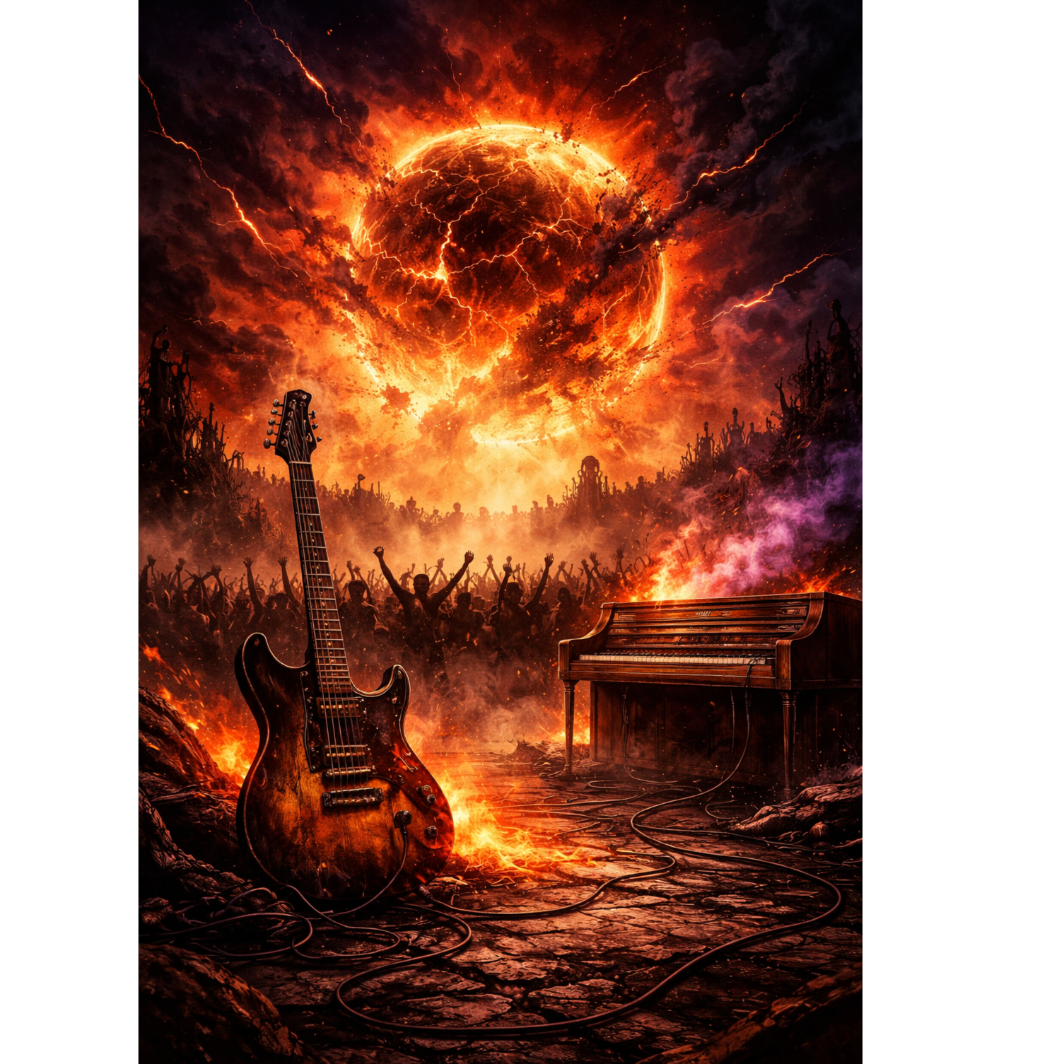 Powerful classic-influenced alternative rock with a strong Deep Purple–style identity, Male lead vocals, gritty, soulful and commanding, bluesy but aggressive, with a live stadium feel, Intro driven by heavy distorted guitar riffs intertwined with prominent Hammond organ, thick and dramatic, supported by thunderous drums, Verses groove hard with pulsing bass, organ stabs and restrained tension, Choruses explode into massive, anthemic hooks, classic hard rock energy, wide open melodies and layered backing vocals built for arena sing-alongs, Dark lyrical mood about sterile fire, destruction and human greed, Bridge intensifies with urgent vocals and rising organ lines, Instrumental break features a fiery guitar solo trading lines with Hammond organ, vintage hard rock attitude, Outro slows into a dramatic, haunting fade with echoing organ, ringing guitars and final crushing chord, Production is warm, analog-inspired, raw yet powerful, classic rock spirit with modern impact, ‑pop