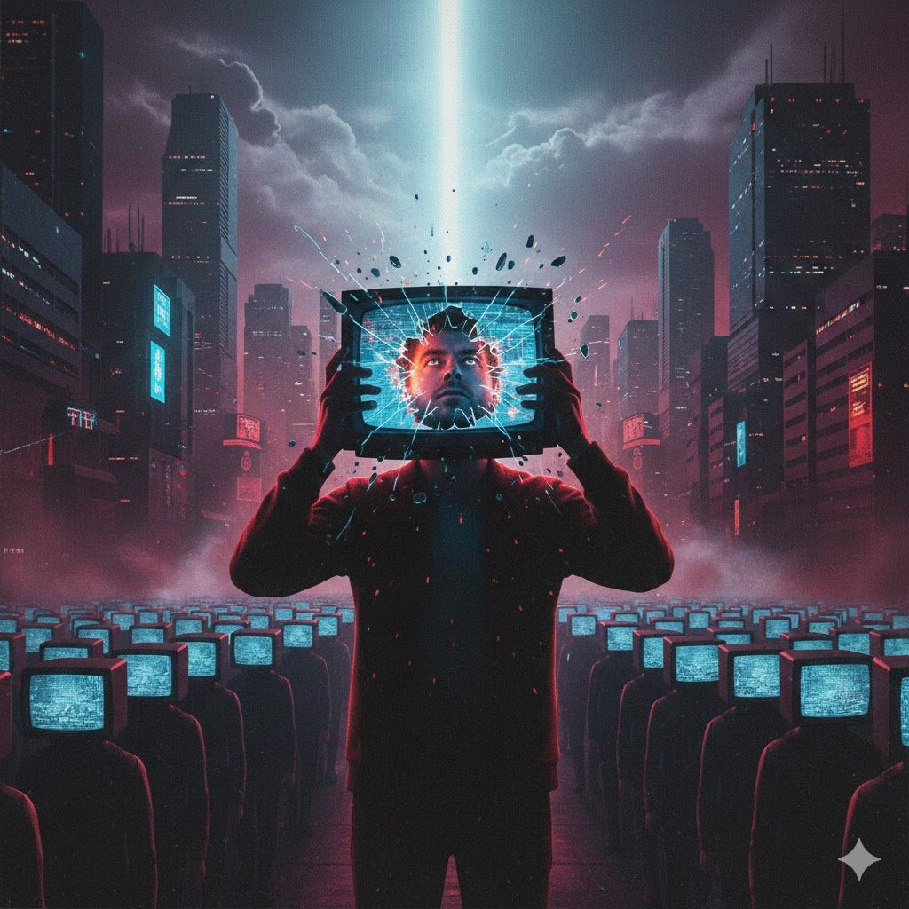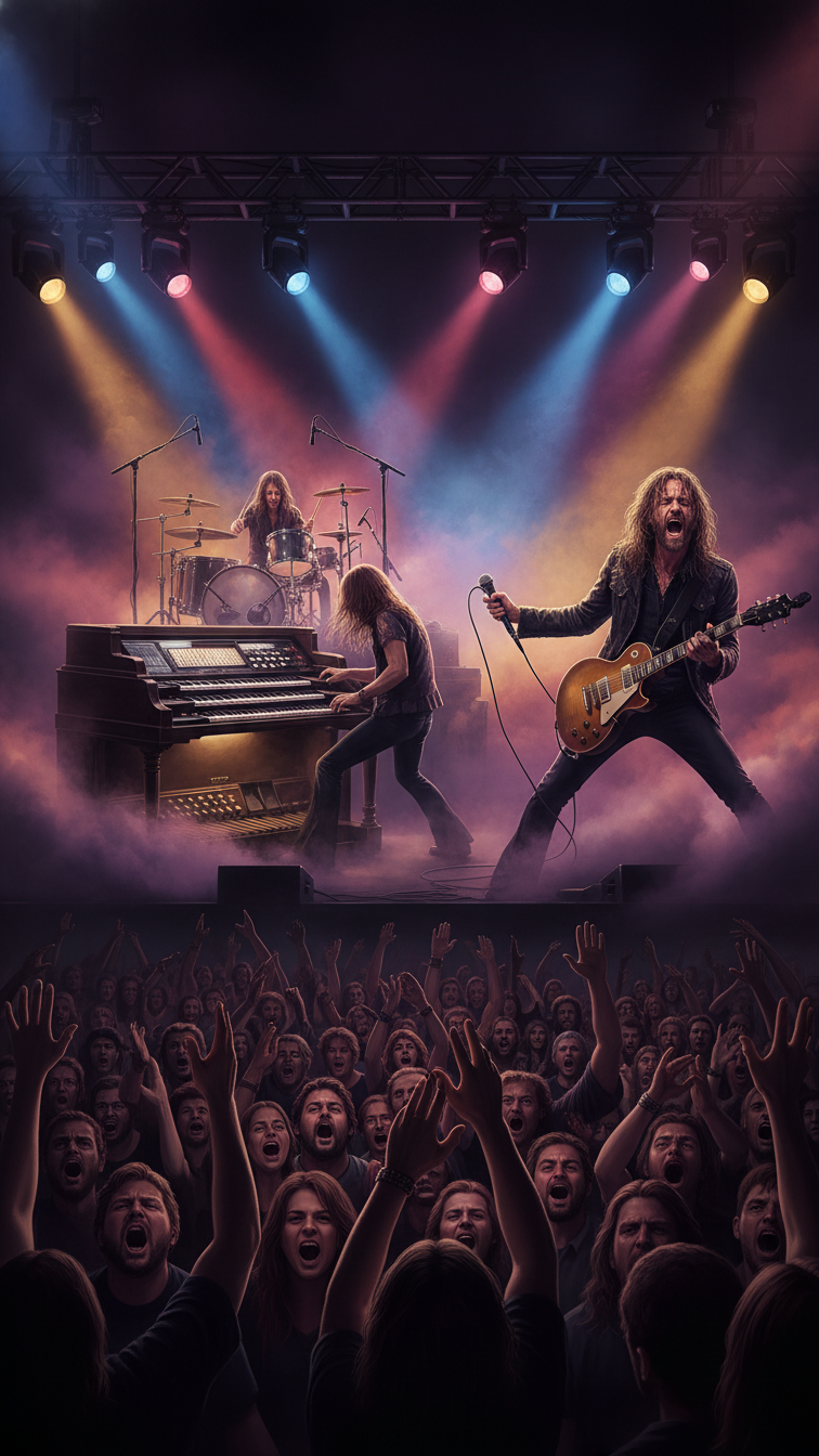 Progressive hard rock live performance, Male lead vocalist with a gritty, powerful, expressive voice, inspired by 70s prog hard rock in the spirit of Deep Purple, Heavy, complex guitar riffs, prominent Hammond organ with Leslie, dynamic drums with occasional tempo shifts, Strong live feeling with crowd noise, chants, clapping, and call-and-response sections where the singer leads and the audience responds, especially on key lines, Lyrics about awakening and rebellion: people slowly silenced not by guns but by screens, routines, comfort, and obedience sold as virtue, The narrator speaks for outcasts and awakened souls who remember the true scream and refuse submission, Dark evolving verses lead to an epic, ritual-like chorus, Include a spoken or half-growled bridge to the crowd, a progressive instrumental section with guitar vs Hammond duel, and a slow, monumental final chorus sung with the audience, Mood: epic, mystical, defiant