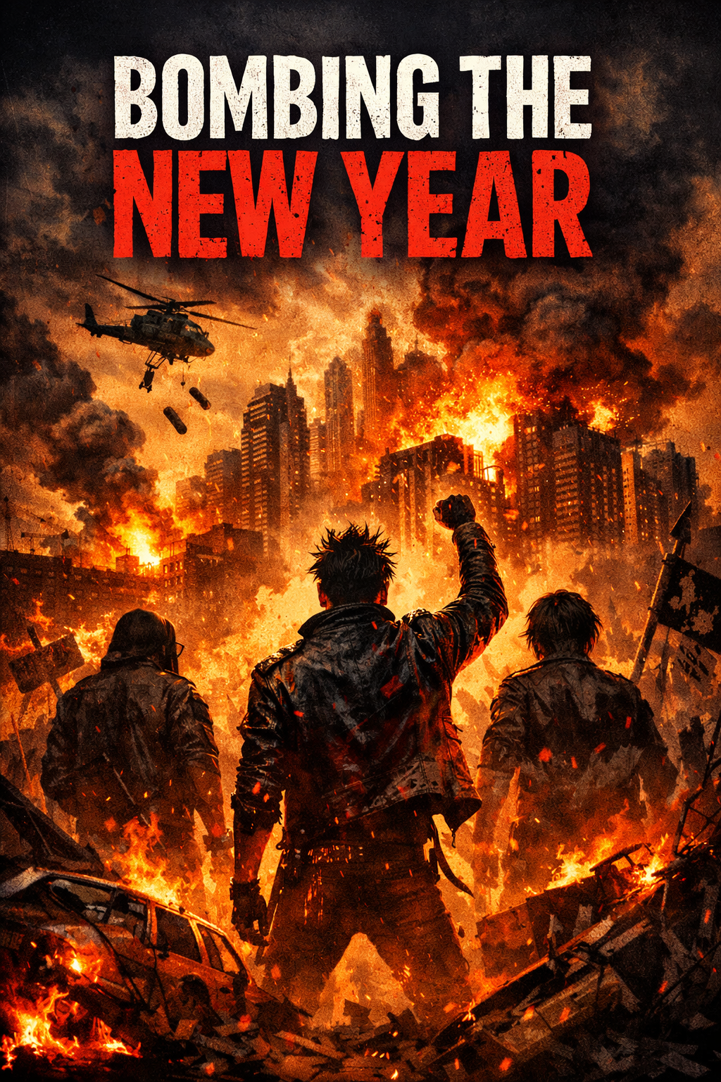 Generate a high-energy epic modern rock song with male vocals and a strong live concert feel, Style: distorted electric guitars, dynamic drums, punchy bass, melodic guitar leads, Vocals: gritty, emotional, powerful, with live-style shouts and crowd-response backing vocals, Tempo: 120–140 BPM, minor key, intense and cinematic, Add live ambience, stage reverb and crowd-like chants in choruses, Lyrics inspired by “They’re bombing the New Year”, with themes of chaos, fire and defiance, lines like “Sirens scream, glass shatters loud / The old year dies beneath the crowd”, End with an epic live outro: half-time feel, sustained power chords, melodic lead guitar, crowd chanting “Still alive”, final crash and fading feedback, Track length 3–4 minutes