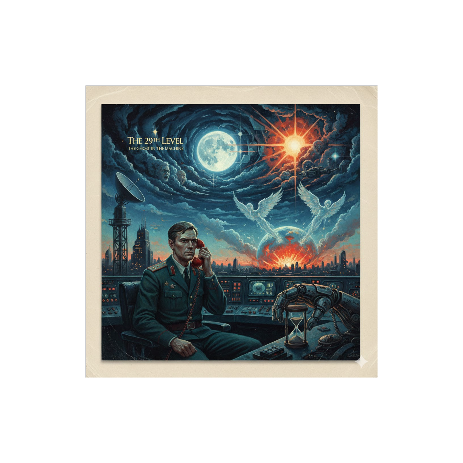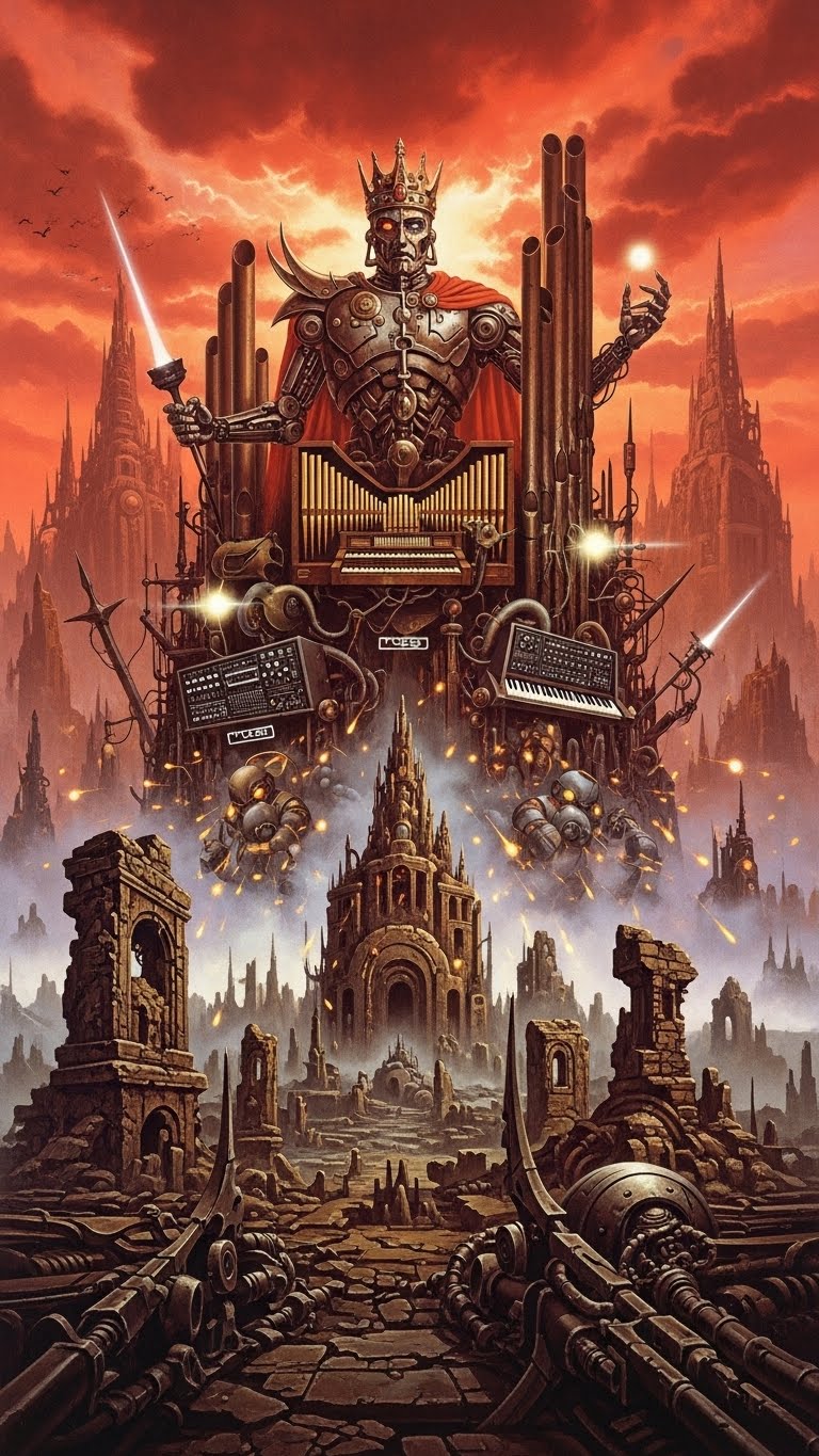 Epic experimental progressive rock inspired by Emerson, Lake & Palmer’s Tarkus and Karn Evil 9, Aggressive, futuristic and theatrical, Dominant distorted Hammond organ, powerful Moog synthesizer leads and bass, grand piano accents, heavy melodic bass guitar and complex, driving drums, Militaristic and mechanical rhythms mixed with sci-fi and avant-garde elements, Frequent and dramatic time signature changes (5/4, 7/8, 9/8, shifting meters), Structure as a continuous prog suite: ominous instrumental intro, heavy organ riff sections, fragmented narrative vocals, recurring dramatic motif, extended instrumental break with Hammond–Moog duel, polyrhythmic middle section, then a dark, theatrical and unresolved ending, Raw 1970s prog sound, no pop, no modern production