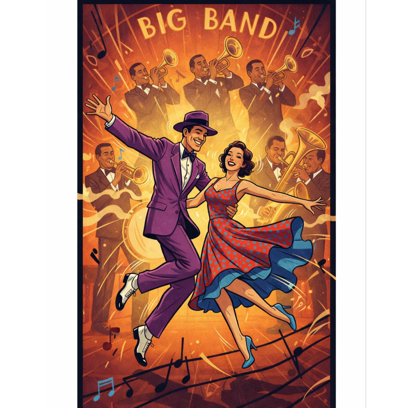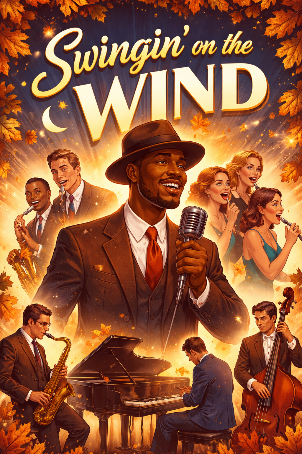 High-energy Big Band Swing, Male baritone Crooner Vocals, 1940s jazz era, roaring brass section, punchy trumpets, rhythmic walking bass, syncopated drums, sophisticated, upbeat, bright production, Lush vocal harmonies, male vocal group backing, barbershop-style layers, harmonized chorus, rich vocal textures, live big band stage vibe
