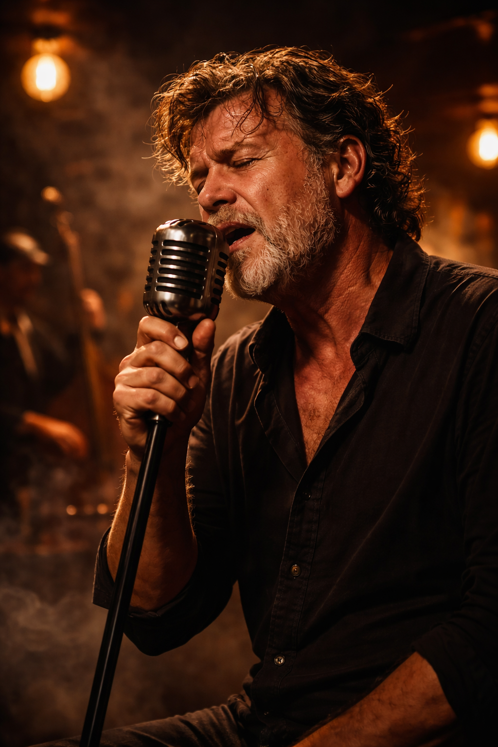 Soulful jazz/soul song, male lead vocal, very raspy and raw, powerful phrasing, no falsetto, Mid-tempo, minor key, smoky late-night vibe, Vintage feel: warm piano, upright bass, brushed drums, subtle Fender guitar riffs instead of horns, Choruses: 4–5 harmonized vocals, tight block harmonies, aligned rhythm with lead, close thirds/fifths, micro-riffs on last note, blended and smooth, Only in choruses, Instrumental break before final chorus: 4–8 bars jazz/soul jam with piano, bass, brushed drums, Fender guitar, Lead and backing return for final chorus