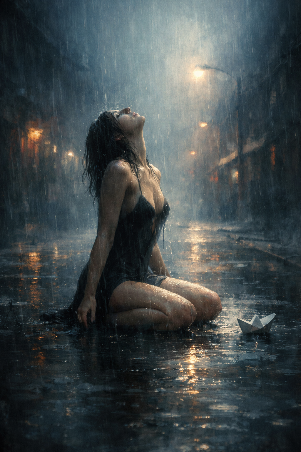 Epic cinematic pop song with raw, raspy, mature female lead vocals, emotional and powerful, Vulnerable, intimate verses; colossal, soaring choruses with massive, layered female choirs harmonizing in thirds and fifths, Full cinematic orchestra: sweeping strings, dramatic brass, timpani, ethereal pads, piano, cinematic percussion, Moderate tempo (~80-90 BPM), key: D minor for a dark, emotional feel, Moody, rain-soaked, deeply emotional atmosphere, Convey isolation, release, fragile hope, drifting like a paper boat, Choirs and orchestral textures dominate, elevating the lead voice, Extreme emotional highs and lows, breathtaking intensity, immersive, unforgettable, emotionally crushing yet beautiful