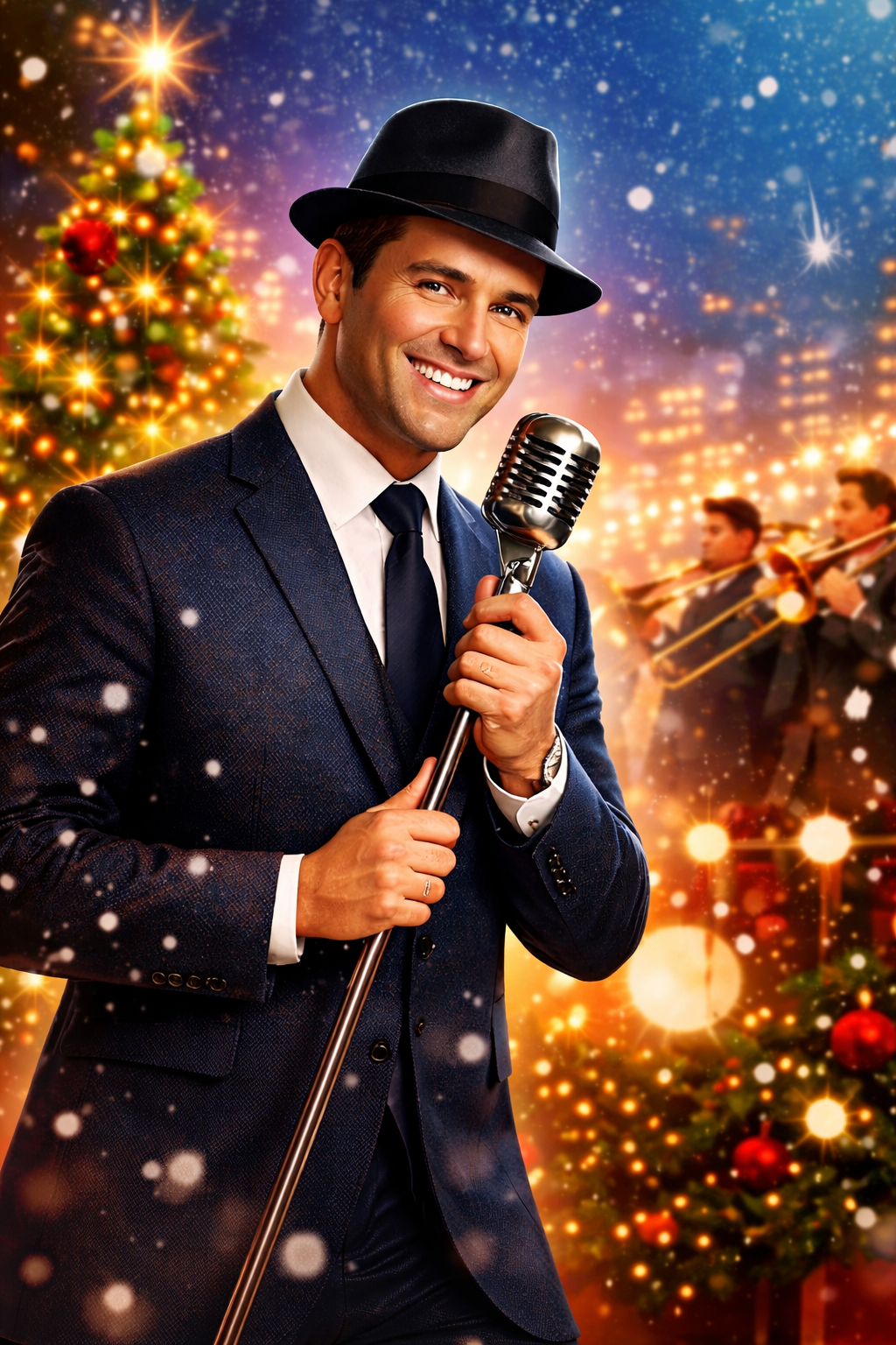 Upbeat Christmas jazz swing song with a joyful, elegant crooner-style male vocal, Fast tempo, bright and festive mood, Classic big band arrangement with modern polish: swinging drums, walking upright bass, piano comping, finger snaps, vibrant brass section with trumpets and trombones, playful saxophones, Warm, charismatic vocal delivery with smile in the voice, smooth phrasing and strong swing feel, Energetic shout chorus, call-and-response horns, dynamic breaks, stop-time accents, Orchestral, lively and celebratory Christmas atmosphere, classy, cinematic and irresistibly fun, Genre: Jazz / Swing / Big Band / Christmas