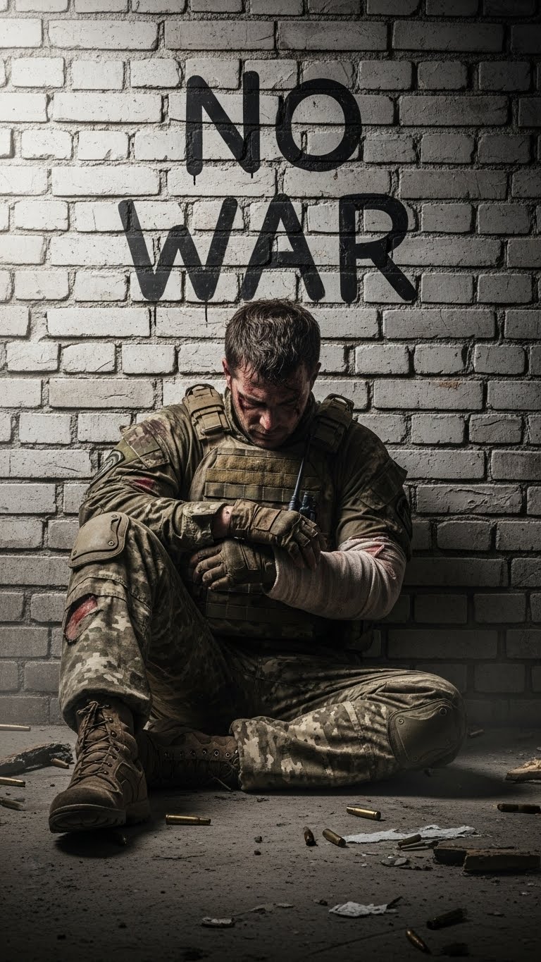 A cinematic hybrid track in the style of Hans Zimmer with an expressive male vocal, Deep piano ostinato, thunderous drums, swelling brass, massive string arcs, Add distant battlefield ambience—echoing blasts, low rumbles, fading gunfire, Tone epic, emotional, heroic but tragic, Lyrics reflect a soldier’s final moments, fog, cracked walls, fading hope, Big trailer-style chorus with male harmonized vocals, huge dynamics, dramatic drops, Outro atmospheric with distant war noise dissolving into reverb