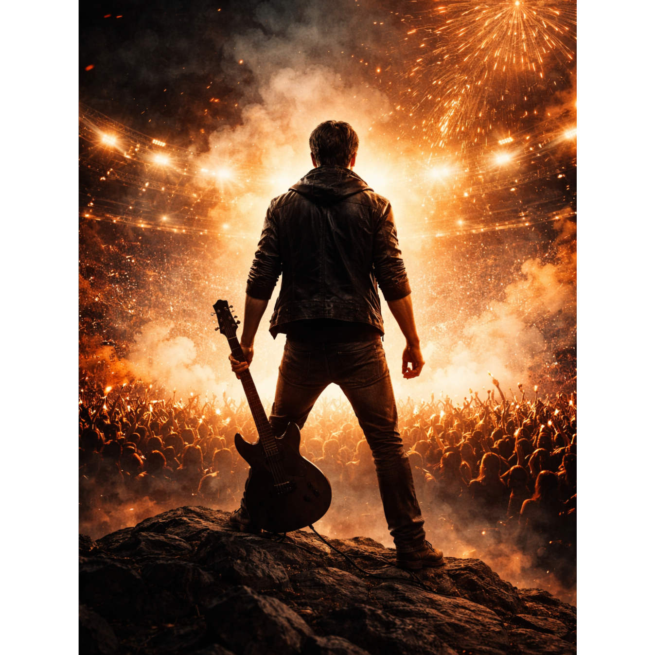 High-energy Arena Rock, male gritty vocals, stadium rock anthem, soaring electric guitar riffs, thunderous drums, massive cinematic production, driving bassline, epic stadium crowd backing vocals in choruses, anthemic, powerful, 80s/90s hard rock influence, explosive energy, rebellious atmosphere, ‑pop