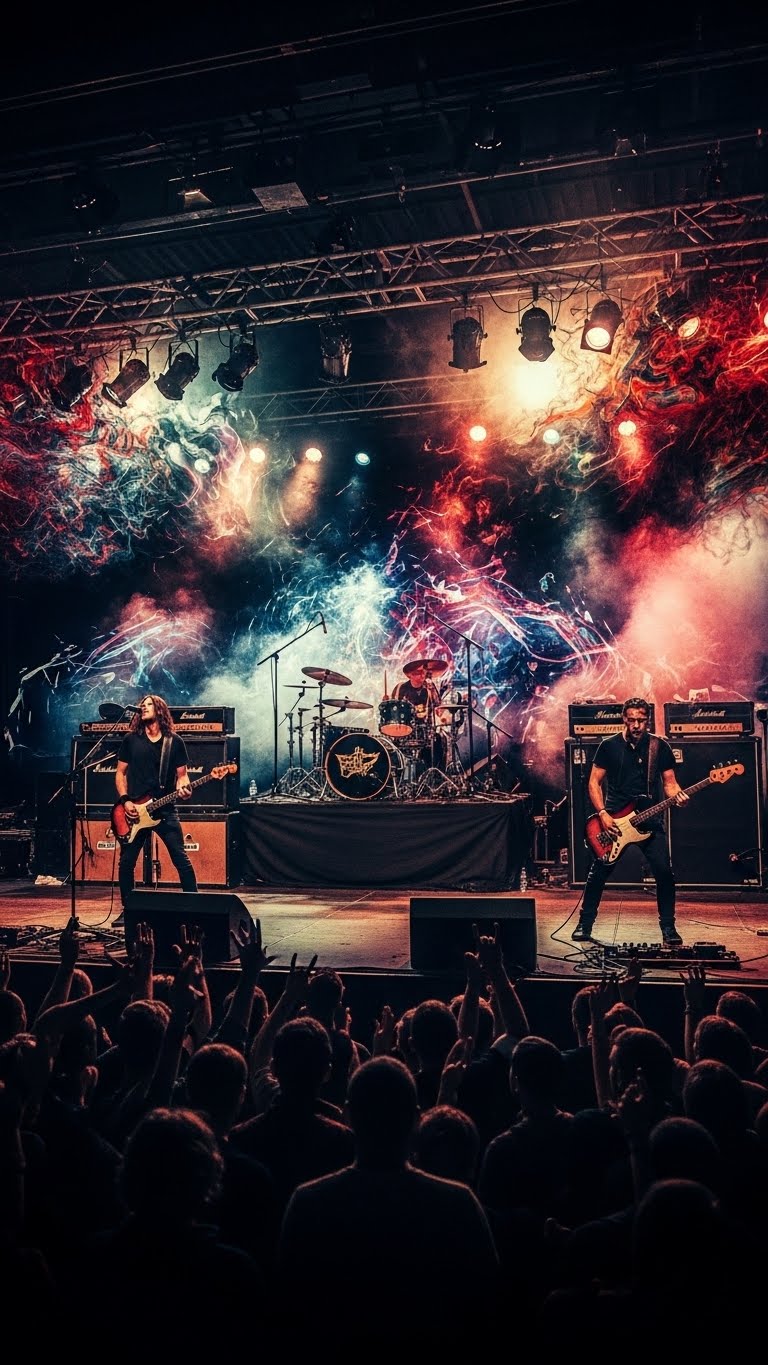 Live hard rock 8–10 min, aggressive, dirty, psychedelic, Liquid-spatial guitars, thick bass, punchy drums, extended solos with feedback/delay, Male vocals raspy, shouted/whispered, separate from instruments, Crowd fully integrated: call-and-response, claps, chants, singing, forming rhythmic and harmonic layers, Dynamics: quiet ambient intro → heavy verse → explosive chorus → breakdowns with whispered vocals and crowd rhythms → chaotic solos, swirling guitars, crowd percussive/atmospheric support → epic finale with full band and audience crescendo, Sudden silences, tension-release, analog warmth, immersive, cinematic, chaotic concert energy