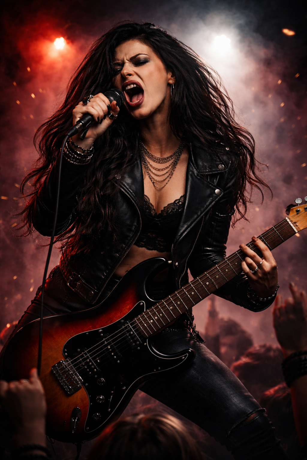 Hard rock song with female contralto lead vocals, live energy, Fast-medium tempo (110–125 BPM), Aggressive electric guitars upfront, distorted riffs, driving bass, energetic drums, Verses: raw, intense, deep vocals, Pre-chorus: rising tension, layered harmonies, Chorus: explosive, anthemic, layered female backing vocals / choir, live feel, Bridge: short screamed/whispered section, minimal instruments, then guitar-driven breakdown into final chorus, Mood: dark, rebellious, cathartic, epic, live, aggressive, cinematic modern rock, Subtle audience sounds, Female vocals only, English lyrics, Vocals: strong, raspy, gritty, emotional, alternating between belts and raw screams, Bridge: short screamed or whispered section, minimal instruments, then full-on guitar-driven breakdown into final chorus, Overall mood: dark, rebellious, cathartic, epic, aggressive, cinematic modern rock production, Female vocals only, English lyrics