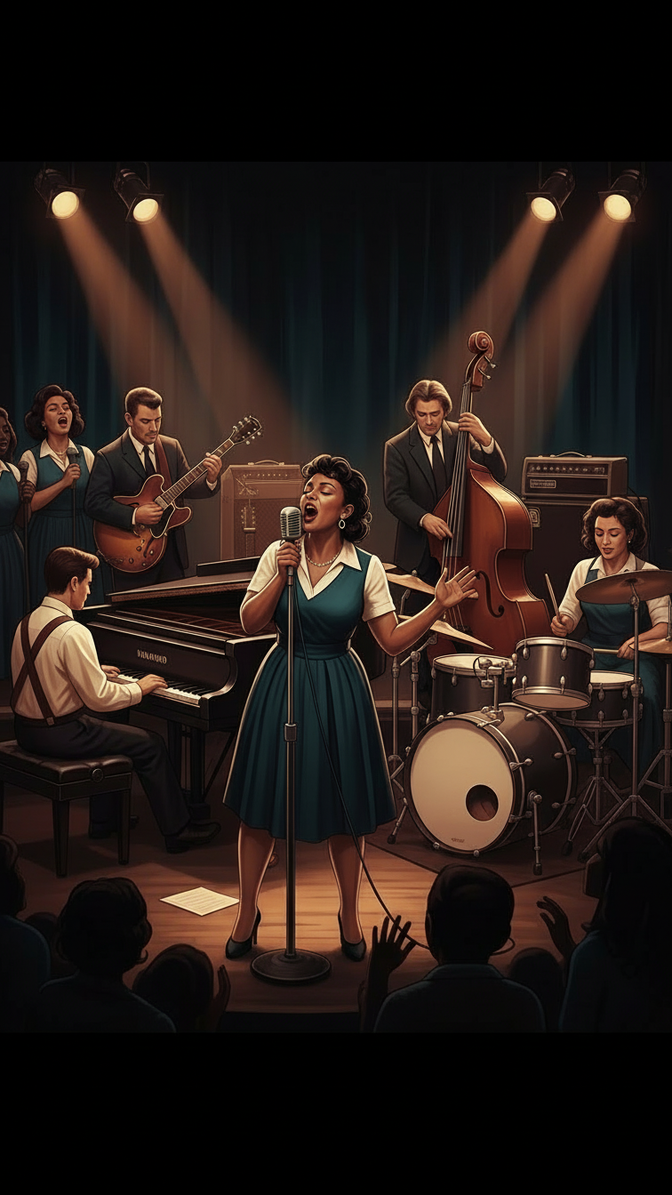 Generate an ultra-epic cinematic live blues club performance with a deep, raspy, powerful female lead vocal, Singer: smoky, soulful, expressive breaths, growls, dynamic vibrato, commanding attention, Atmosphere: 1950s-style low-lit blues club, realistic audience reactions, ambient reverb, Band: electric guitar, upright bass, punchy drums, Hammond/piano, extended solos building intensity, Add layered female gospel-style vocal ensemble with rising harmonies, call-and-response lines, melodic riffs, and dramatic “oooh/ahh” accents crescendoing with the band, Mood: electrifying, emotional, cinematic, immersive, capturing a live performance climax, Lead voice must remain front and dominant, interacting dynamically with ensemble and band