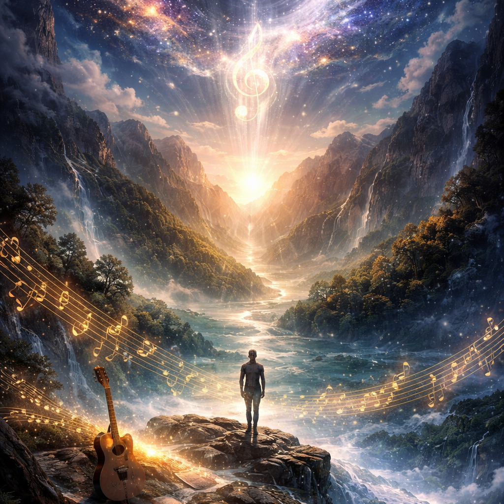 Male lead vocal, warm expressive baritone, Symphonic progressive rock with cinematic, atmospheric sound, Medium tempo (~90 BPM), evolving and dynamic arrangement, Ethereal analog synth intro, orchestral pad swell, 12-string acoustic guitar arpeggio, deep spacious reverb, Verses intimate and melodic, minimal rhythm, soft strings and synth pads, Pre-chorus builds tension with pulsing bass synth and gradual orchestral rise, Choruses expansive and uplifting with STRONG multi-layered vocal harmonies, stacked and choir-like backing vocals, wide symphonic soundstage, rich orchestral strings, Verse 2 adds steady drum groove and clean electric guitar accents, Second chorus grand and powerful, symphonic climax, Guitar solo melodic and sustained, soaring lead with symphonic synth interplay, Outro fades slowly with choir harmonies, hypnotic vocal echoes, evolving spacey synths, Analog warmth, cinematic depth, immersive stereo field, English lyrics clear and central