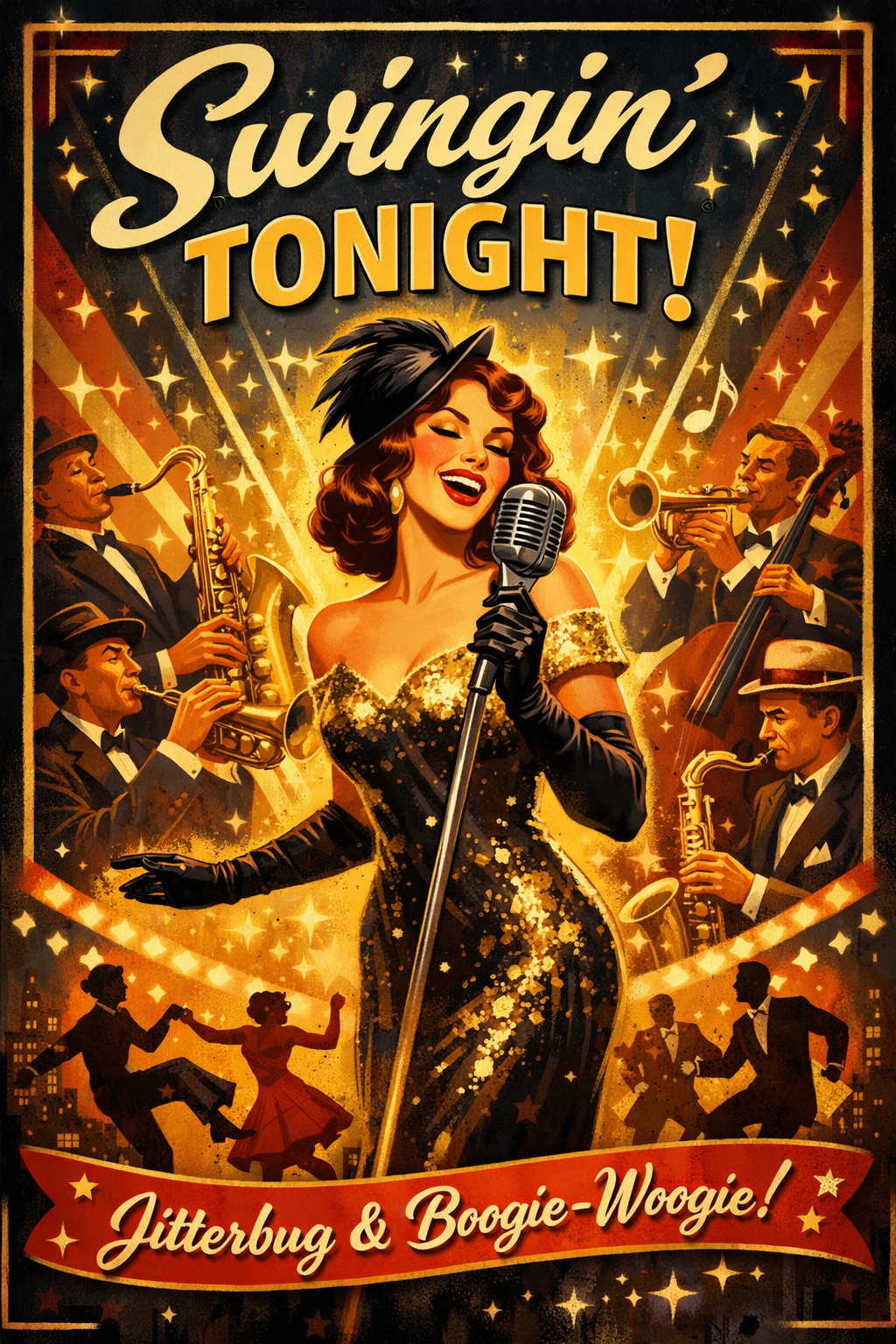Female jazz singer leading a high-energy 1930s-40s swing song, backed by full big band: trumpets, trombones, saxophones, piano, upright bass, drums, and vibrant background vocals, Background singers constantly echo, punctuate, and respond to the lead singer in playful call-and-response, creating a lively, interactive atmosphere, Singer’s voice is bright, cheeky, expressive, with jazzy phrasing, swing rhythm, syncopation, and playful dynamics, Include classic swing slang (hep cat, jitterbug, boogie-woogie), Background vocals add harmonic richness, emphasize punchlines, and enhance big band energy, Fun, engaging, and full of authentic live swing excitement