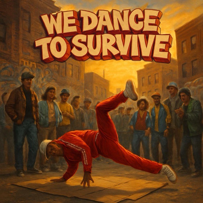 Oldschool 1984 street break anthem with cinematic urban grit, 110 BPM classic breakbeat foundation blended with raw boom bap punch, Heavy kick, sharp snare cracks, dusty vinyl texture, deep rolling funk bass and chopped drum breaks driving cypher intensity, Aggressive DJ scratches and turntable cuts in transitions, subway reverb ambience, metallic city atmosphere, Male vocal with confident rap delivery, slight rasp, storytelling tone with controlled melodic hook, Energy builds from underground tension to triumphant street power, Analog warmth, gritty mix, wide stereo drums, raw Bronx battle vibe, no glossy polish, pure culture and survival spirit, Layered crowd chants in hook sections, subtle 80s electro synth stabs for authenticity, Breakdown with filtered drums before explosive final chorus lift