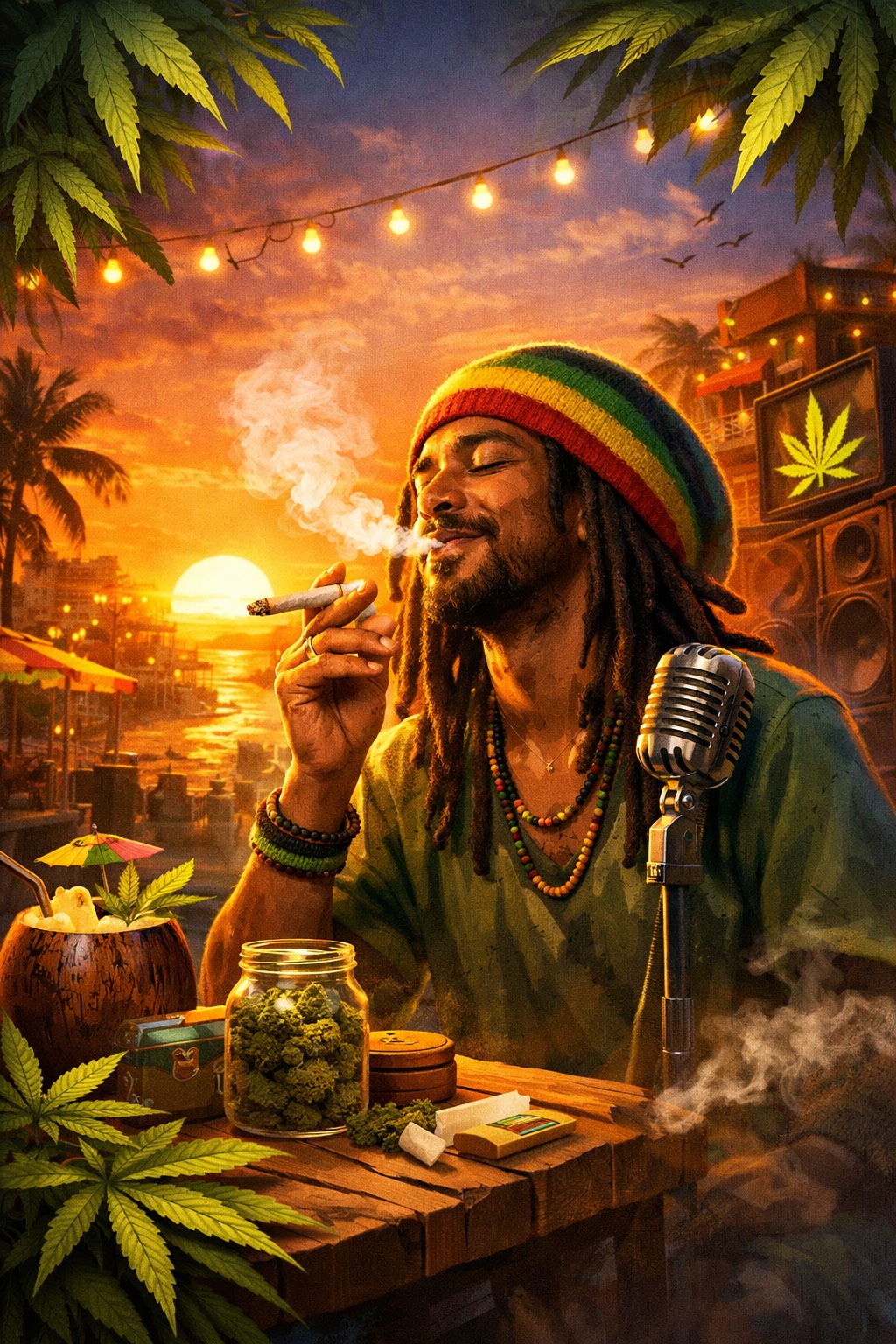 Laid-Back Reggae Song Performed As A Powerful Live Arena Performance With Huge Crowd Energy And Festival Atmosphere, Target Tempo Around 85–90 Bpm With Deep Warm Reggae Groove, Heavy Bouncing Bassline And Relaxed Skanking Guitar, Rich Caribbean Instrumentation Featuring Steelpan Melodies, Warm Organ Chords, Dub-Style Echo Delays And Offbeat Percussion, Emotional Theme Of Deep Poetic Love For Cannabis, Weed Or Spliff, Expressed With Spiritual Warmth And Calm Joy, Male Vocal Style With Light Reggae Dialect / Patois Influence, Smooth And Soulful Delivery, Massive Stadium Reverb, Crowd Cheers, Call-And-Response Moments And A Hypnotic Sing-Along Chorus That Echoes Across The Arena