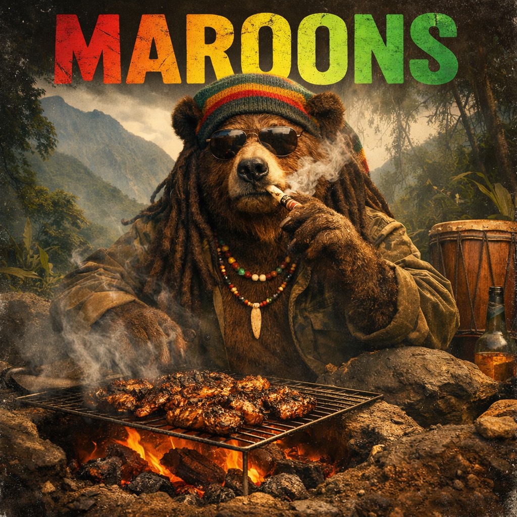 Deep roots reggae driven by ancestral Jamaican energy and militant calm, Tempo around 70–74 BPM with a heavy one-drop groove that feels grounded and timeless, Thick, warm analog bass rolling deep and steady, sharp skanking guitar with gritty attack, subtle bubble organ and layered Nyabinghi hand drums underneath, Earthy, raw production with natural room ambience, jungle air, distant echoes and light tape saturation, like sound traveling through mountains at night, Male lead vocals delivered in authentic Jamaican patois, strong, confident and commanding, half-sung half-chanted, carrying history, resistance and pride, Vocal tone is warm, slightly rough, spiritual and authoritative, Overall mood is powerful, smoky and uplifting — freedom, survival and legacy carved from fire, drums and land