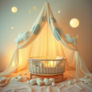 A gentle lullaby featuring soft fingerpicked acoustic guitar, light piano, and subtle strings, Layers of warm synth pads and delicate glockenspiel add a soothing, uplifting tone, The arrangement remains sparse, with a calming flow and gentle dynamics throughout, radiating warmth