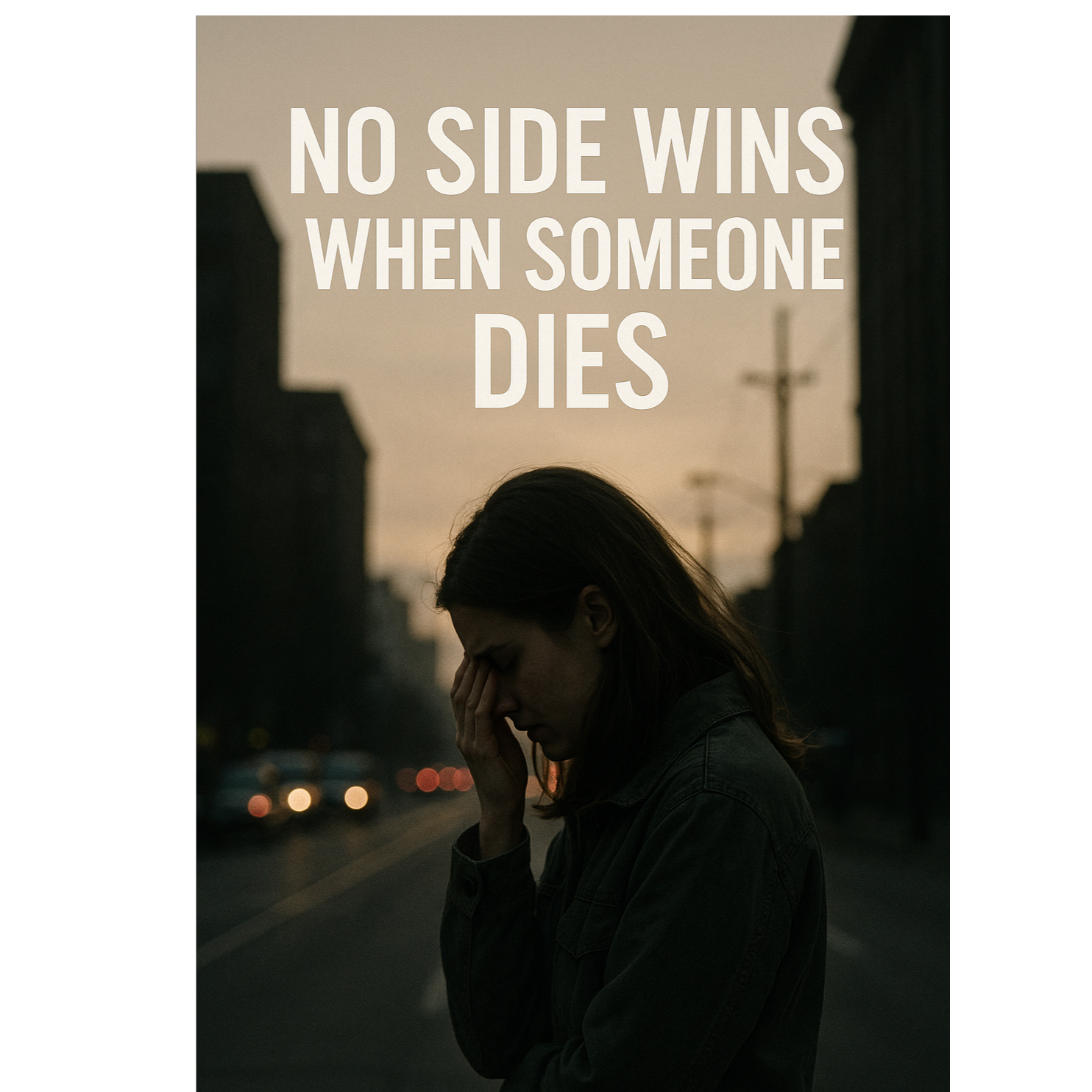 Cinematic pop / emotional alternative rock duet, 80 bpm, Very soft and minimal at first (piano, pads), male voice calm and reflective, female voice fragile and emotional, Build tension in the pre-chorus, full wide sound in the choruses with drums, guitars and strings, Bridge is intimate, almost whisper, then explode into a cathartic, soaring final chorus, Mood: melancholic, sincere, deeply emotional, but ends with hope, Main hook: “No side wins when someone dies, ”
