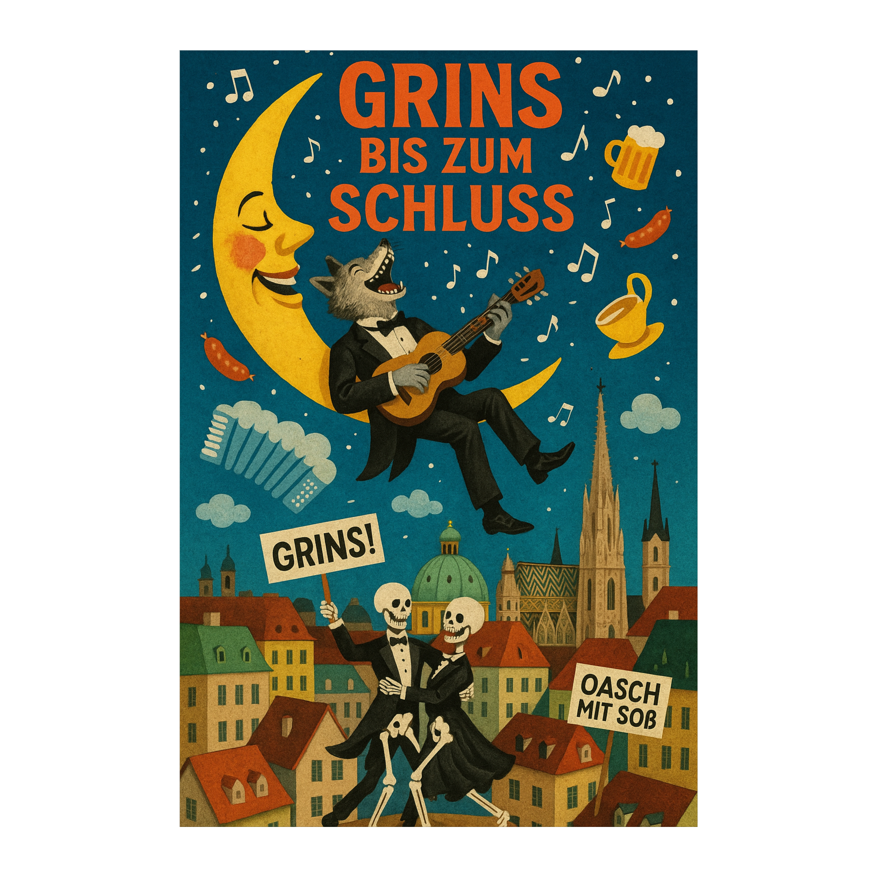 Create a German electro-swing cabaret song with sarcastic lyrics, vaudeville piano, ironic whistling, and spoken word interludes