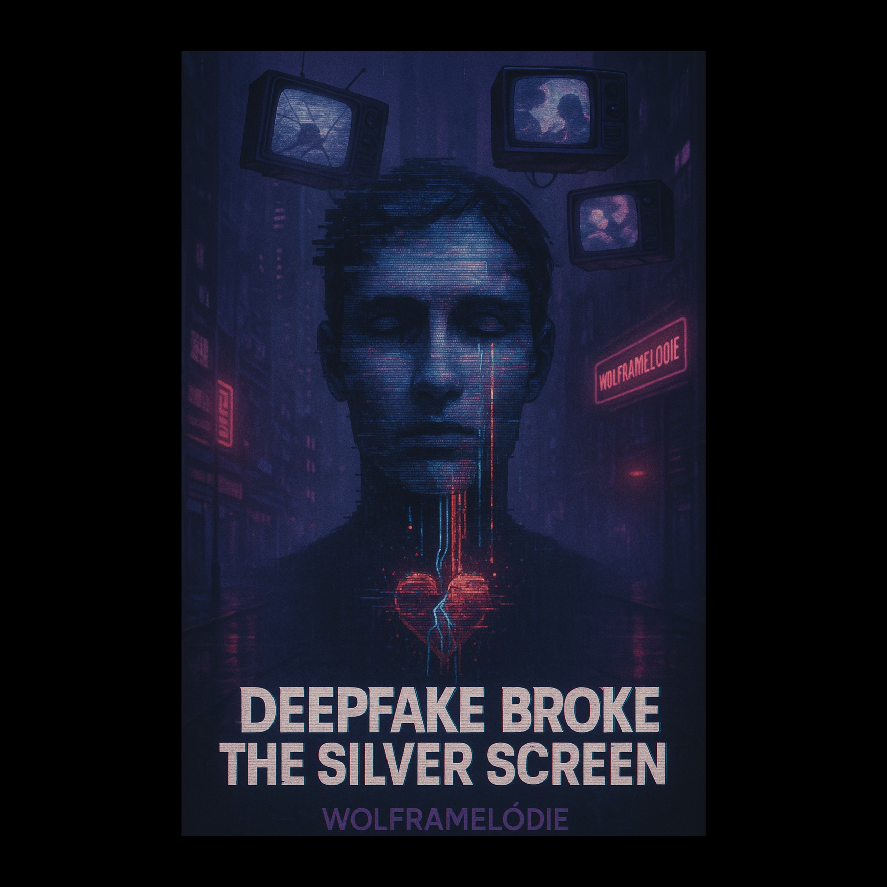 A synthpop cyberpunk song opens with retro-futuristic synth arpeggios, underpinned by pulsating analog bass and crisp electronic drums, Glitch effects punctuate transitions, Melancholy harmonies build through layered pads, Distorted, echo-laden vocals cut through, pushing a dramatic, digital atmosphere