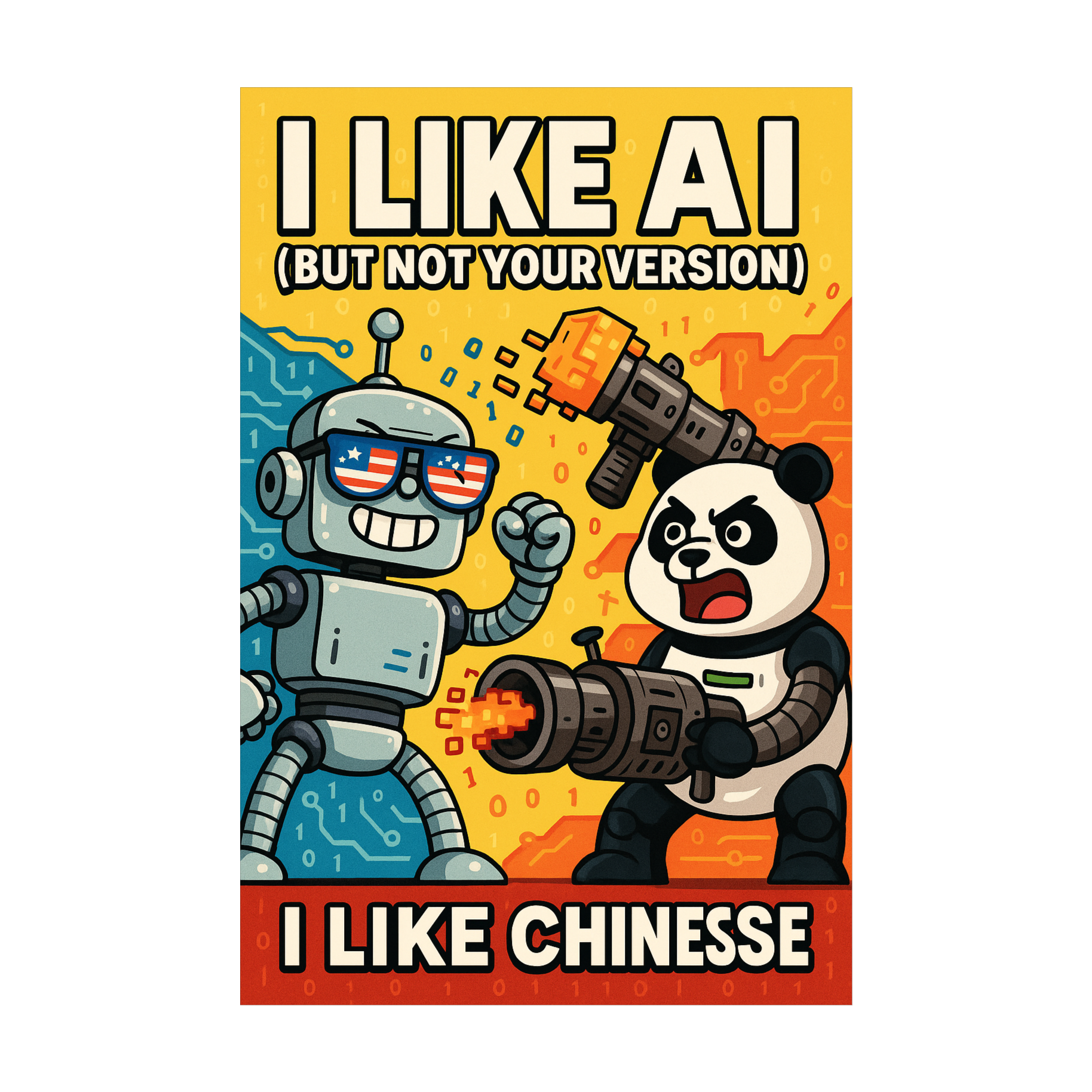 Create a theatrical comedy-pop song with glitchy synths, playful orchestration, and satirical energy, Style blends Broadway musical and meme-culture absurdity, Use cartoonish vocals, ironic choir harmonies, and spoken lines, The track should sound like a digital cabaret about the AI arms race between the US and China, with cheeky lyrics and chaotic fun
