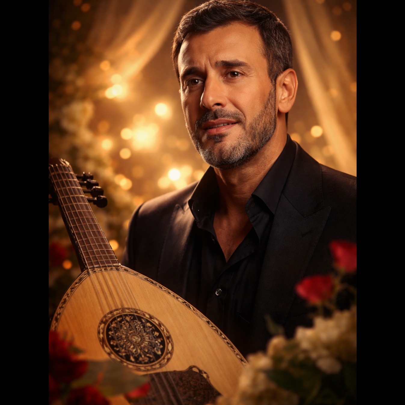 Arabic tarab, classic ghazal, maqam nahawand, 66 BPM, rubato phrasing, qanun tremolo, oud fingerpicking, bowed strings, frame drum brushes, riq accents, warm analog tape, natural hall reverb, mono brass swells, intimate verses, powerful chorus, emotional phrasing, dynamic crescendos, vintage orchestral balance