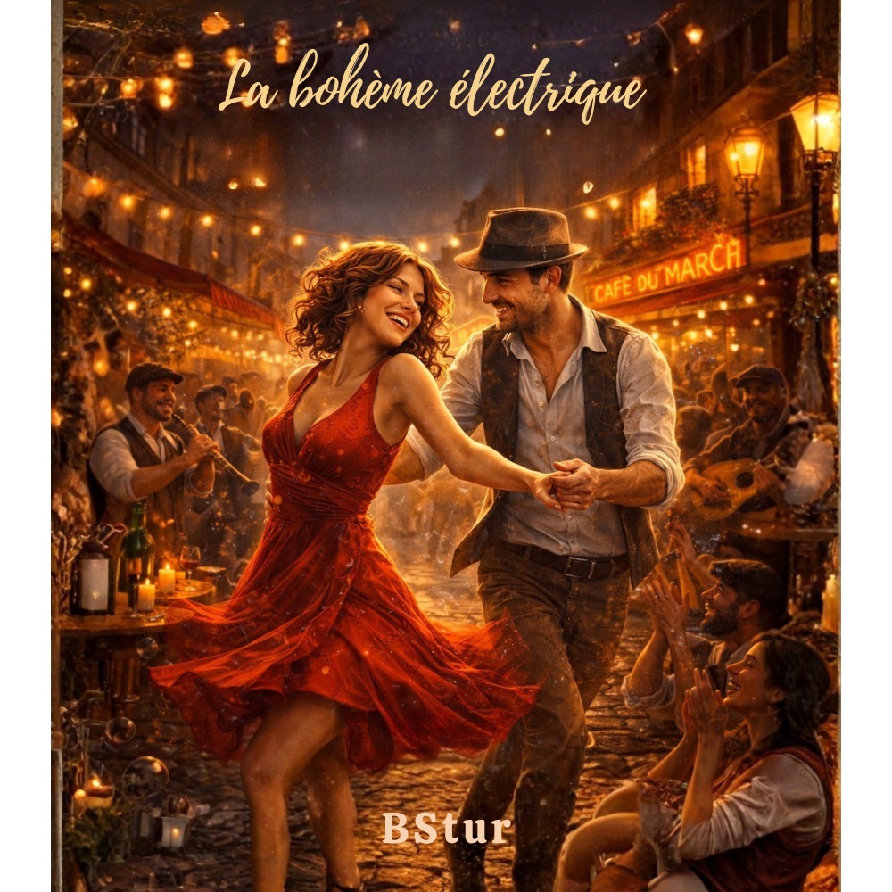Upbeat electro-swing / gypsy-jazz pop, très dansant et solaire, 122 BPM, tonalité Sol majeur avec petites touches mineures colorées, Female lead vocal playful, expressive, slightly ironic, Catchy powerful choruses, light scat phrases between lines, Instrumentation: guitare manouche picking, upright bounce bass, swing-pop drums with clap accents, festive brass and clarinet in bridges, Light glitch “confetti” textures, warm analog tape tone, Paris street-festival energy, joyful, bohemian night atmosphere, Modern electro swing groove