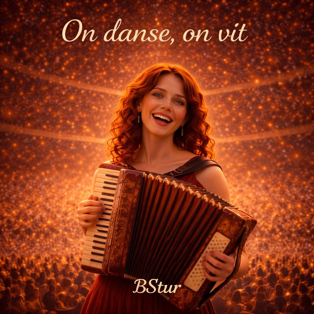 French spoken-word chanson, chamber pop, 115 BPM, lively accordion melody, rhythmic acoustic guitar, soft piano chords, brushed percussion, handclap stomp rhythm, light string accents, warm room ambience, crowd singalong, call and response vocals, group harmonies, expressive female lead, dynamic build release, joyful uplift, intimate live performance
