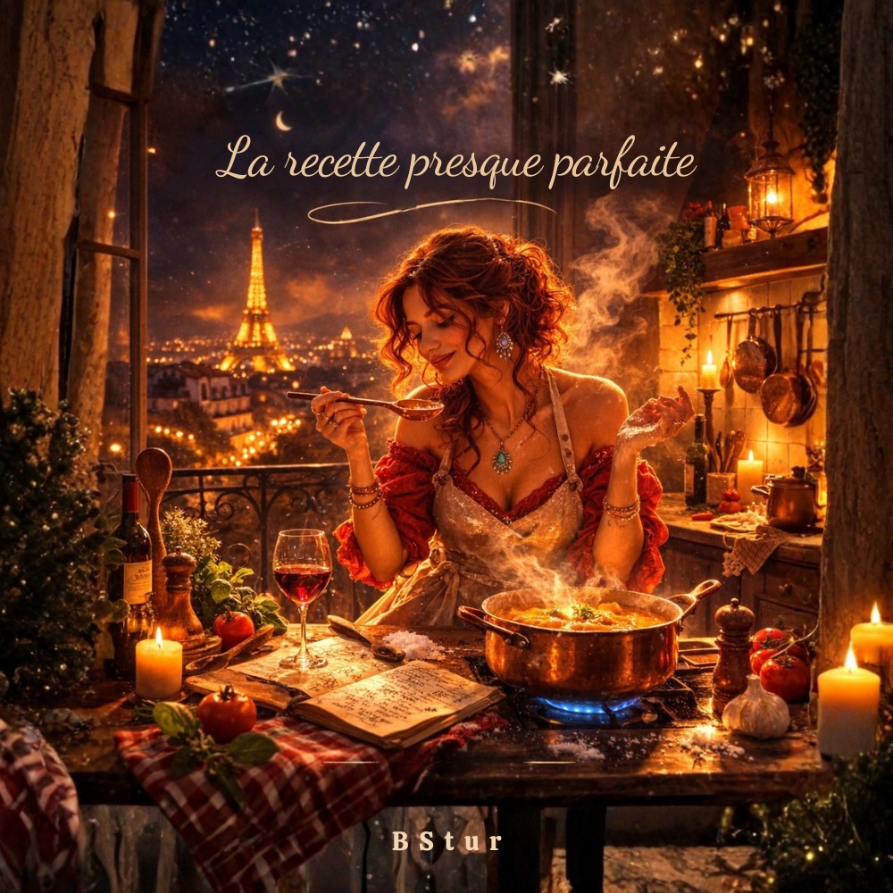 Playful gypsy-jazz / French chanson, light swing around 105 BPM, warm intimate male vocal with a smiling tone, Expressive storytelling delivery with gentle humor, Instrumentation: guitare manouche fingerpicking, upright bass walking, brushed jazz drums, playful clarinet and subtle accordion touches, Cozy Parisian kitchen atmosphere, romantic and charming mood, lively but soft groove, Choruses slightly fuller and melodic, verses intimate and conversational, joyful bohemian vibe