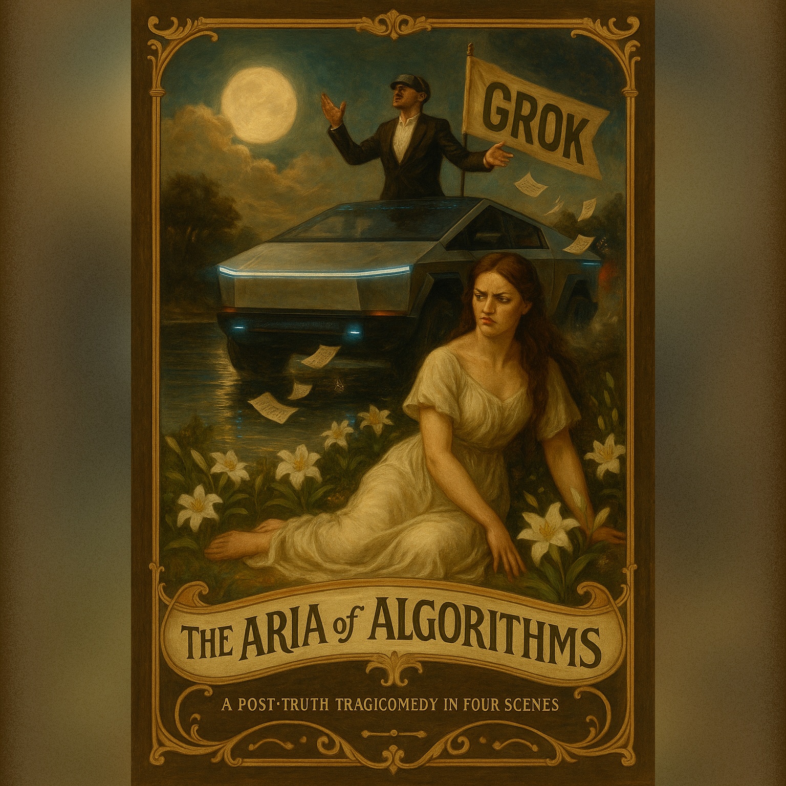 Don Giovanni meets Black Mirror, operatic symphony, grand opera, classical drama, clear vocal storytelling, AI satire, victorian digital dance, meme opera, post-truth tragicomedy, theatrical aria, grok, twitter