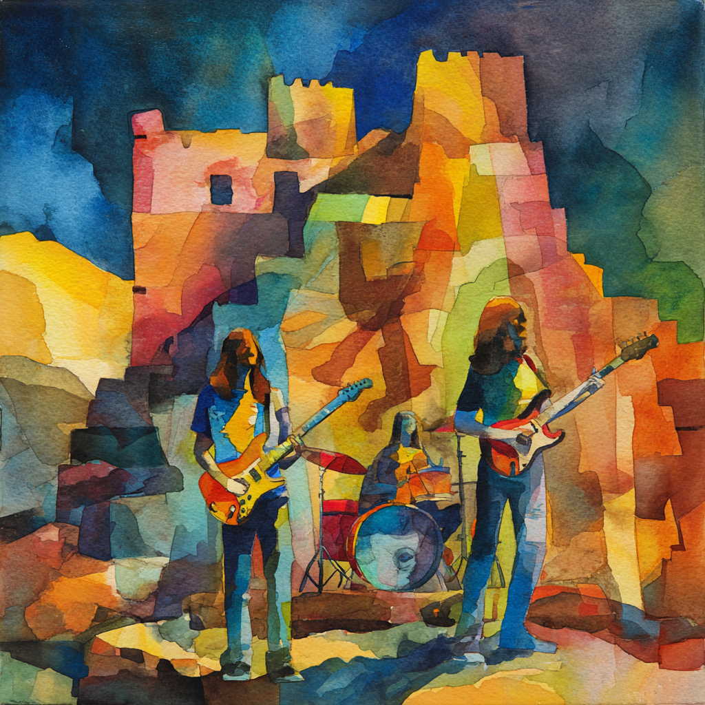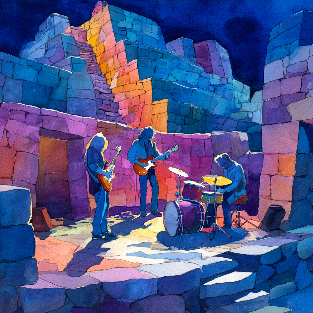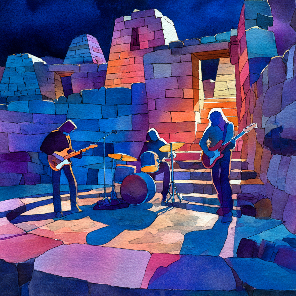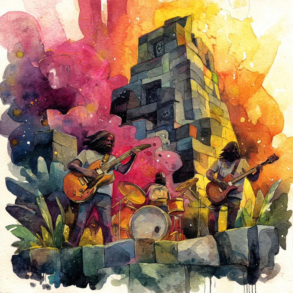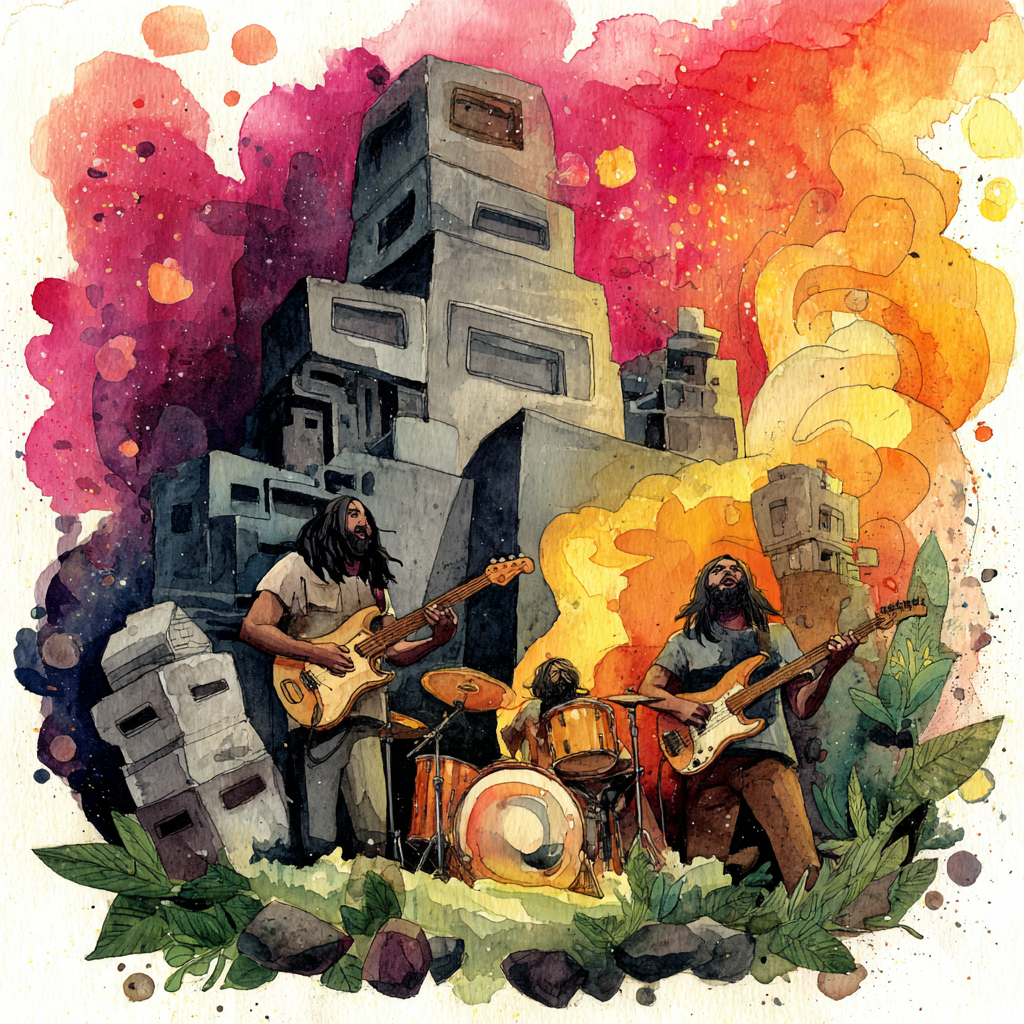 Experimental psychedelic rock, delay, distortion, noise rock, A swirling experimental psychedelic rock track begins with modulated guitars soaked in delay and heavy distortion, setting a dense, trippy atmosphere, Drums pound with unpredictable patterns, layered with bass fuzz, Noise rock elements erupt in breakdowns, blending feedback, warped synths, and chaotic textures