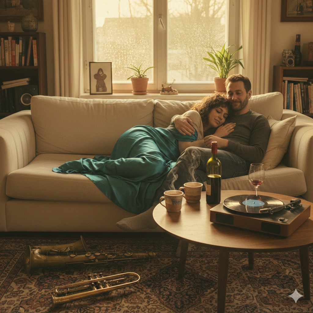 Jazzy Lo-Fi Soul / Sophisti-Pop, Elements: 78 BPM, mellow smoky Saxophone leads, muted Trumpet flourishes, warm upright bass, vintage vinyl crackle, brushed drum kit (jazz style), soft Rhodes electric piano, intimate soul-male vocals, breezy and romantic atmosphere, cinematic horn section swells