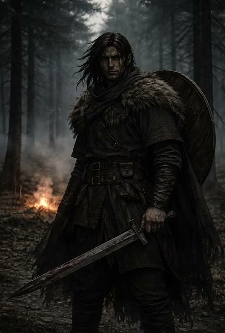 A Powerful, Emotional Pagan Metal, Viking Metal, Pagan Folk, Viking Folk, dark atmospheric, emotional, epic, cinematic Nordic sound, shamanic throat-singing accents, Nordic female choir, heavy drums like war-hammers, thunderous toms, deep bass, icy atmospheric strings, epic horns, Celtic/Nordic flutes, distorted folk-metal guitars, Tagelharpa, nyckelharpa, bone flute, horns, Deep, emotional male lead vocals Occasional throat-singing or growls for intensity Echoing Nordic female backing vocals, ethereal and haunting Call-and-response chanting in chorus Wide, atmospheric reverb like a long Viking hall, Vibe: Tragic, powerful, ancient, sorrowful, mythic, heroic, fateful, cold northern twilight, Mood & Imagery: