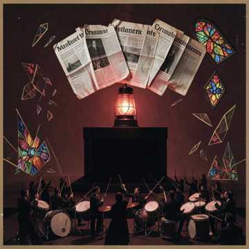 cinematic pop, rock opera, solemn baritone, unison chant, church organ, grand piano octaves, snare march, low brass stabs, gospel choir hit, tape saturation, room mic bleed, mono vocal, minor key, slow build, explosive chorus, 90s film score, raw live take